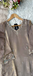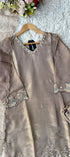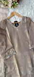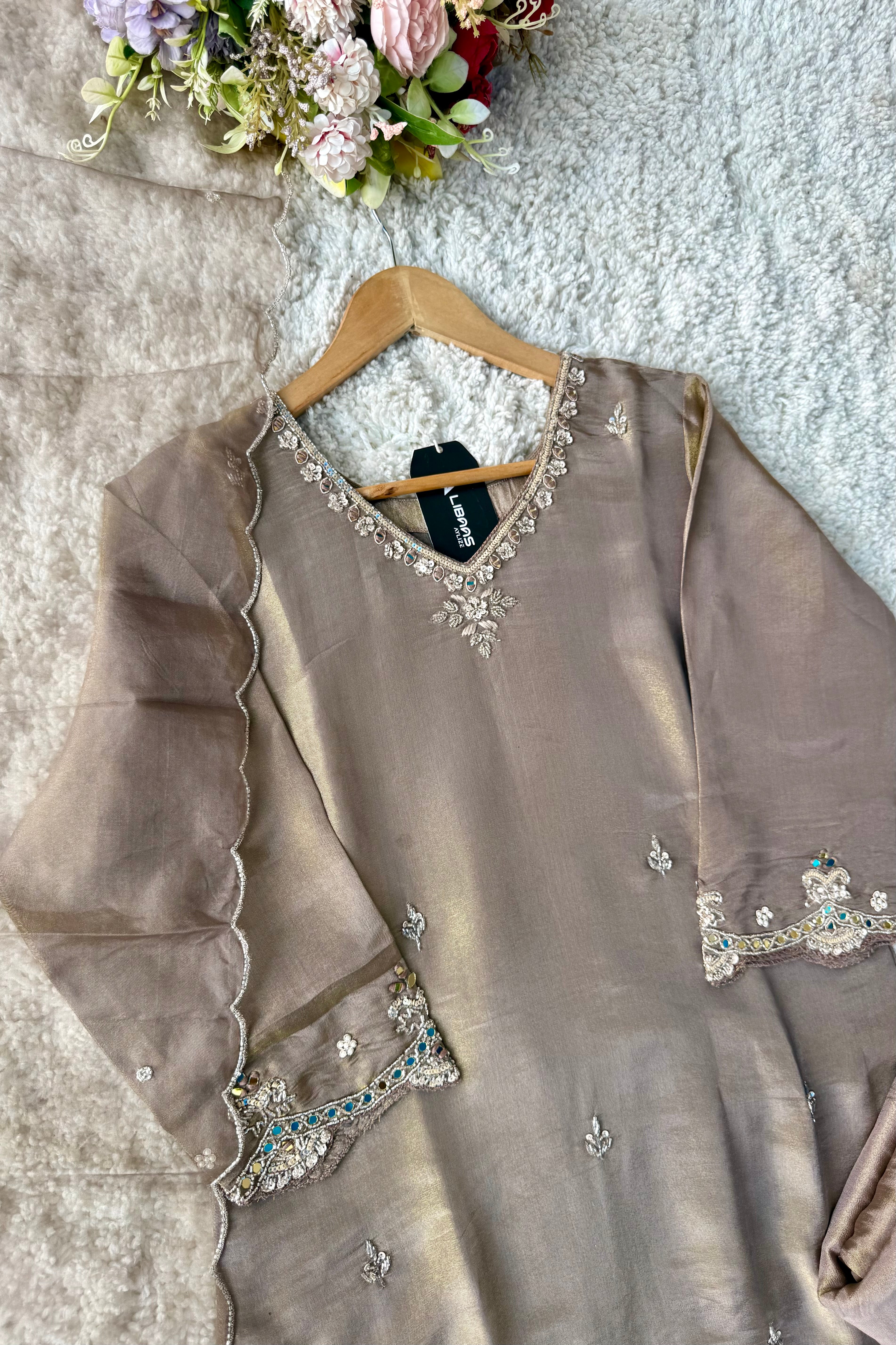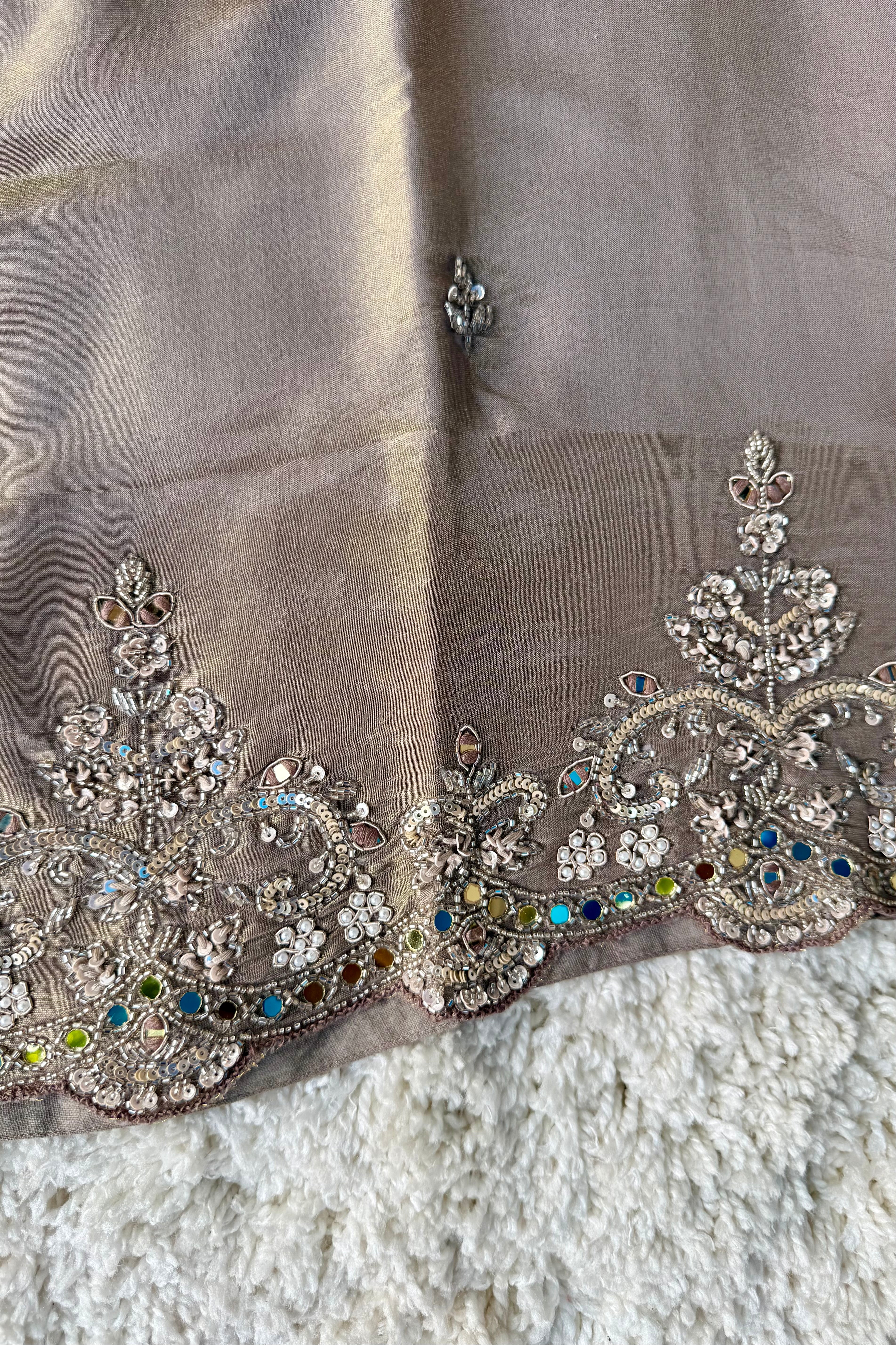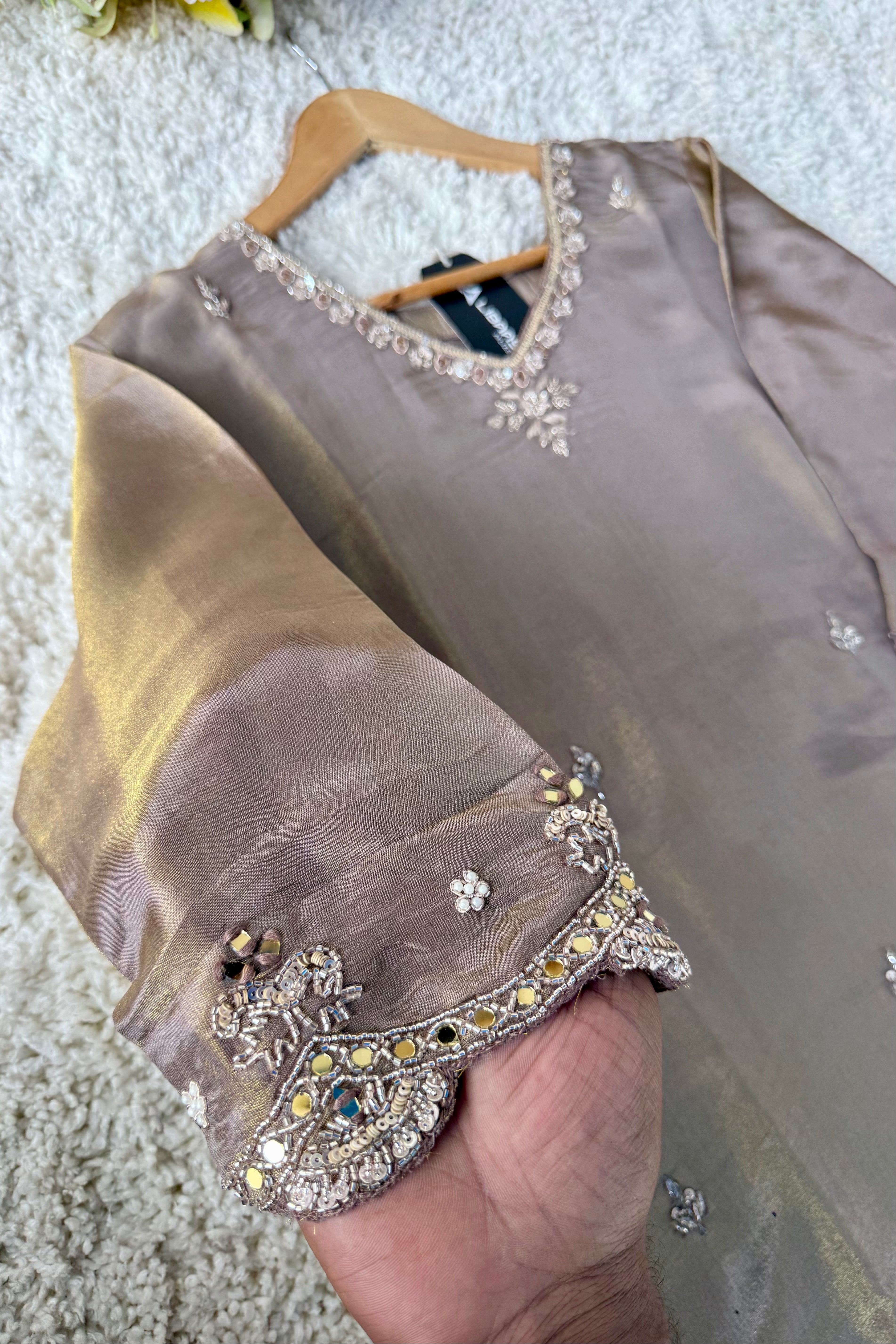 This Champagne Gold Blush crushed tissue suit with heavy handwork is made for moments that matter.