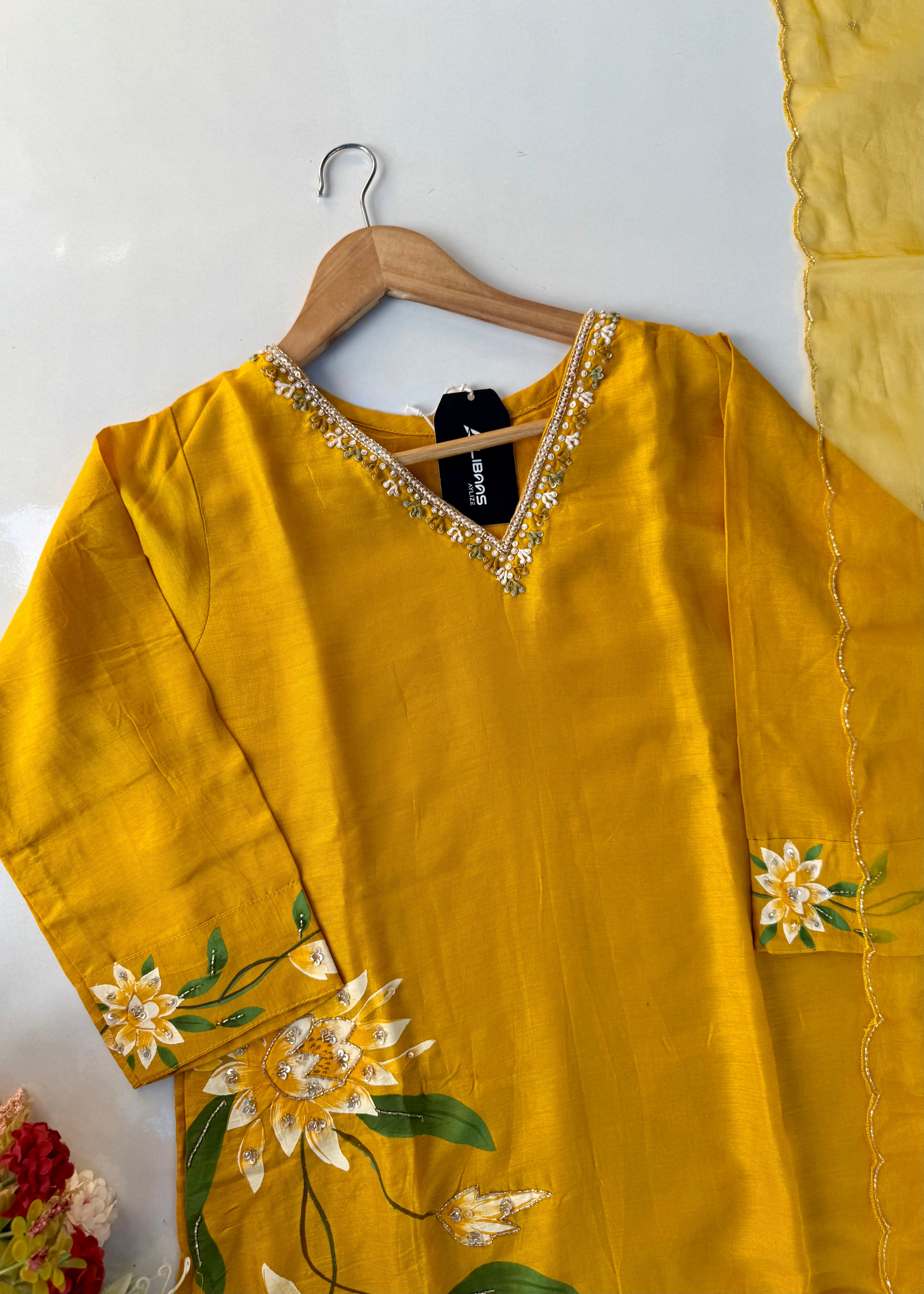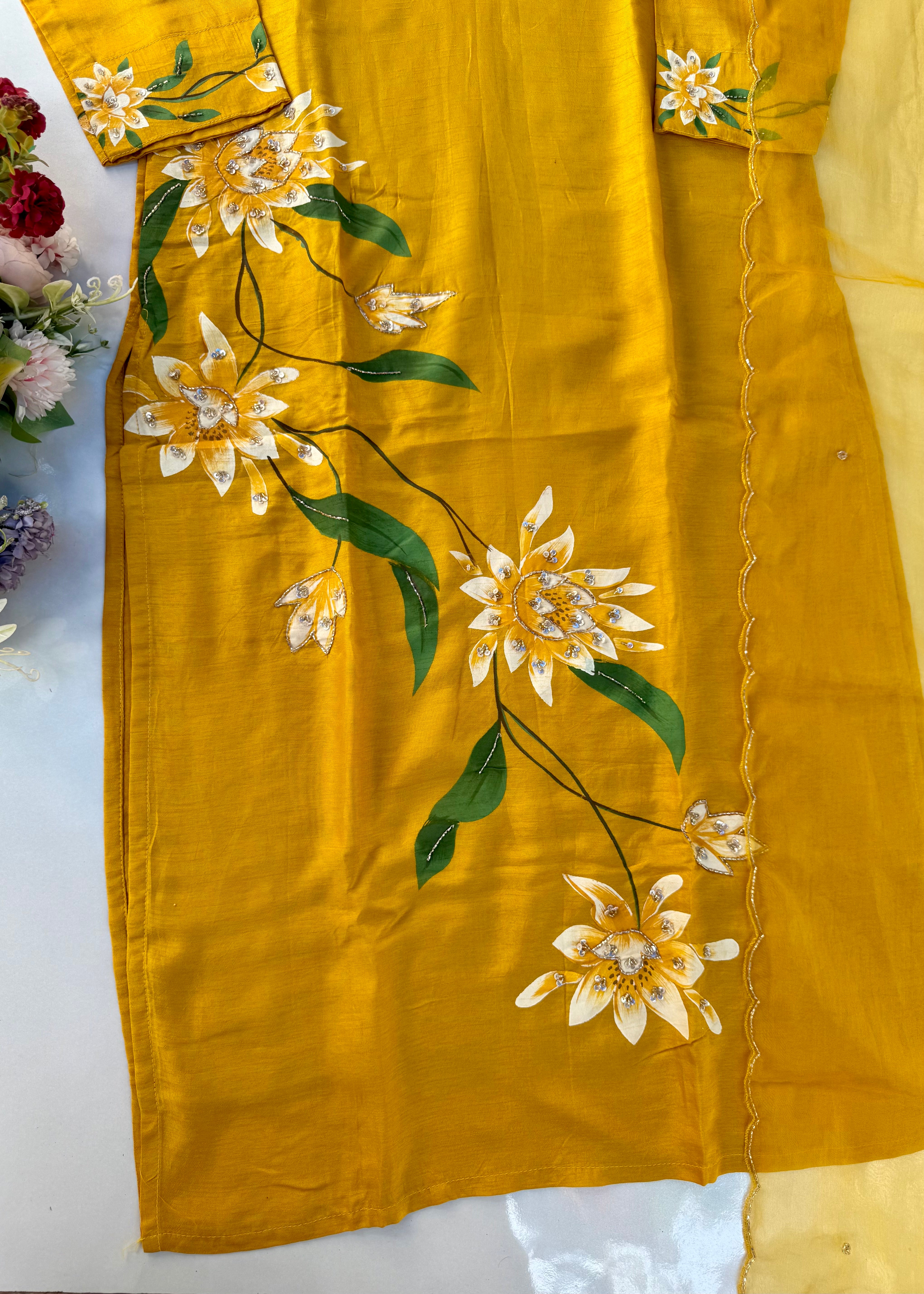 “Yeefa” Mustard Yellow dola silk hand print kurta set
