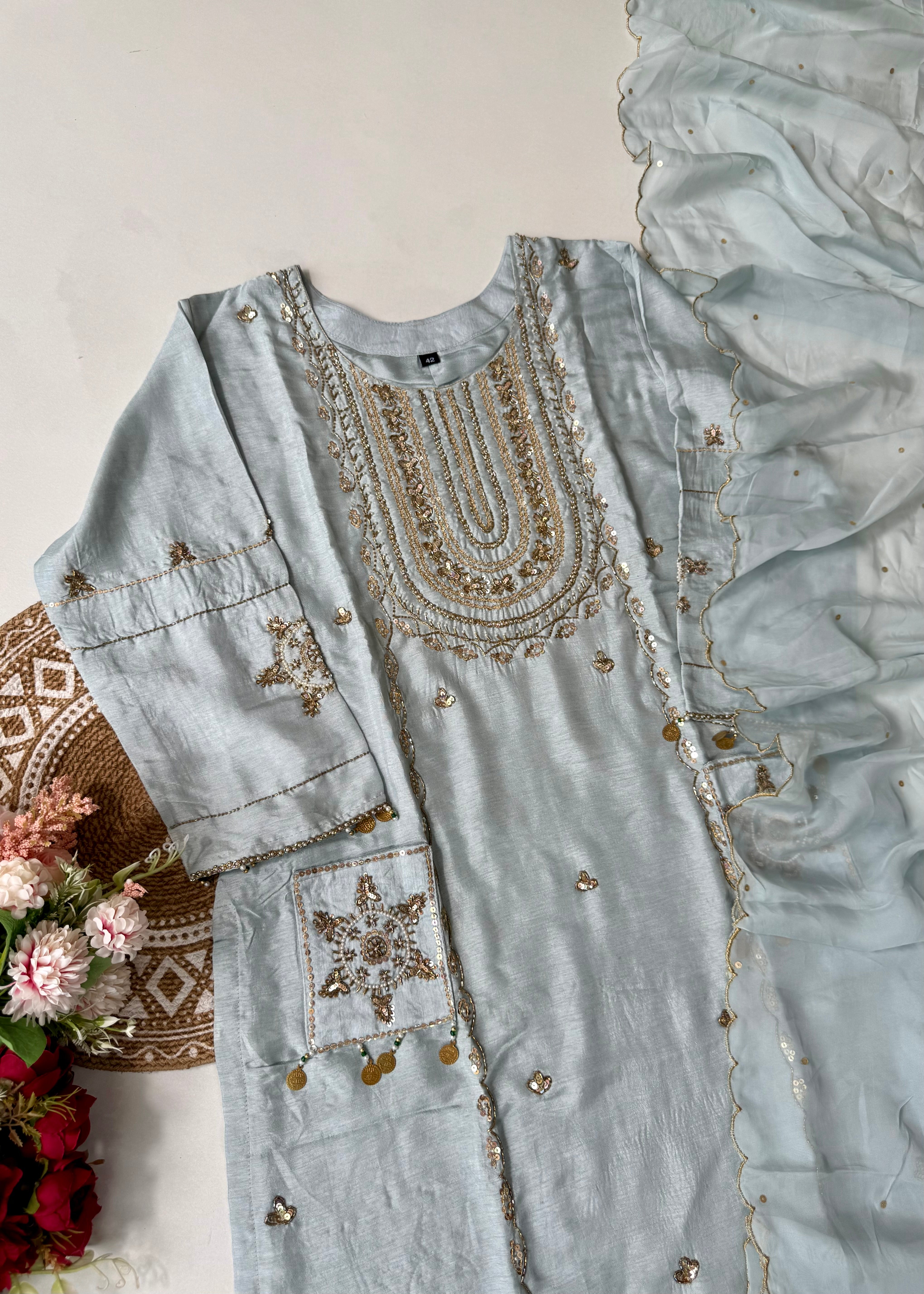 “Aylize” Elegant Dola Silk heavy handwork Kurta Set with Dupatta