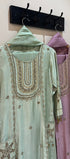 This premium ensemble features intricate embroidery on the neckline and hemline, paired with a matching Dola Silk bottom and a delicate embroidered dupatta with scalloped edges. Perfect for festive gatherings, wedding celebrations, and special occasions.