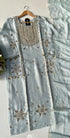 This premium ensemble features intricate embroidery on the neckline and hemline, paired with a matching Dola Silk bottom and a delicate embroidered dupatta with scalloped edges. Perfect for festive gatherings, wedding celebrations, and special occasions.