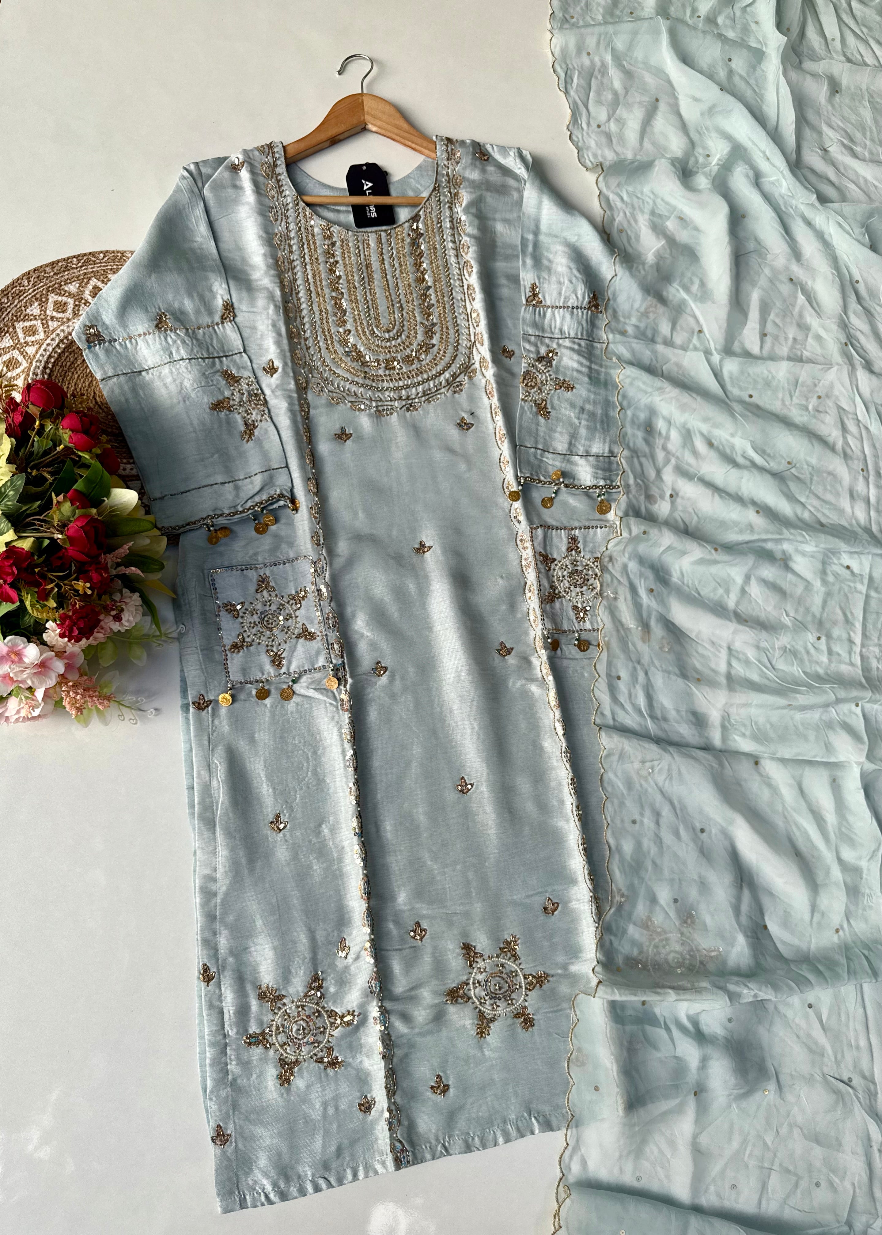 “Aylize” Elegant Dola Silk heavy handwork Kurta Set with Dupatta