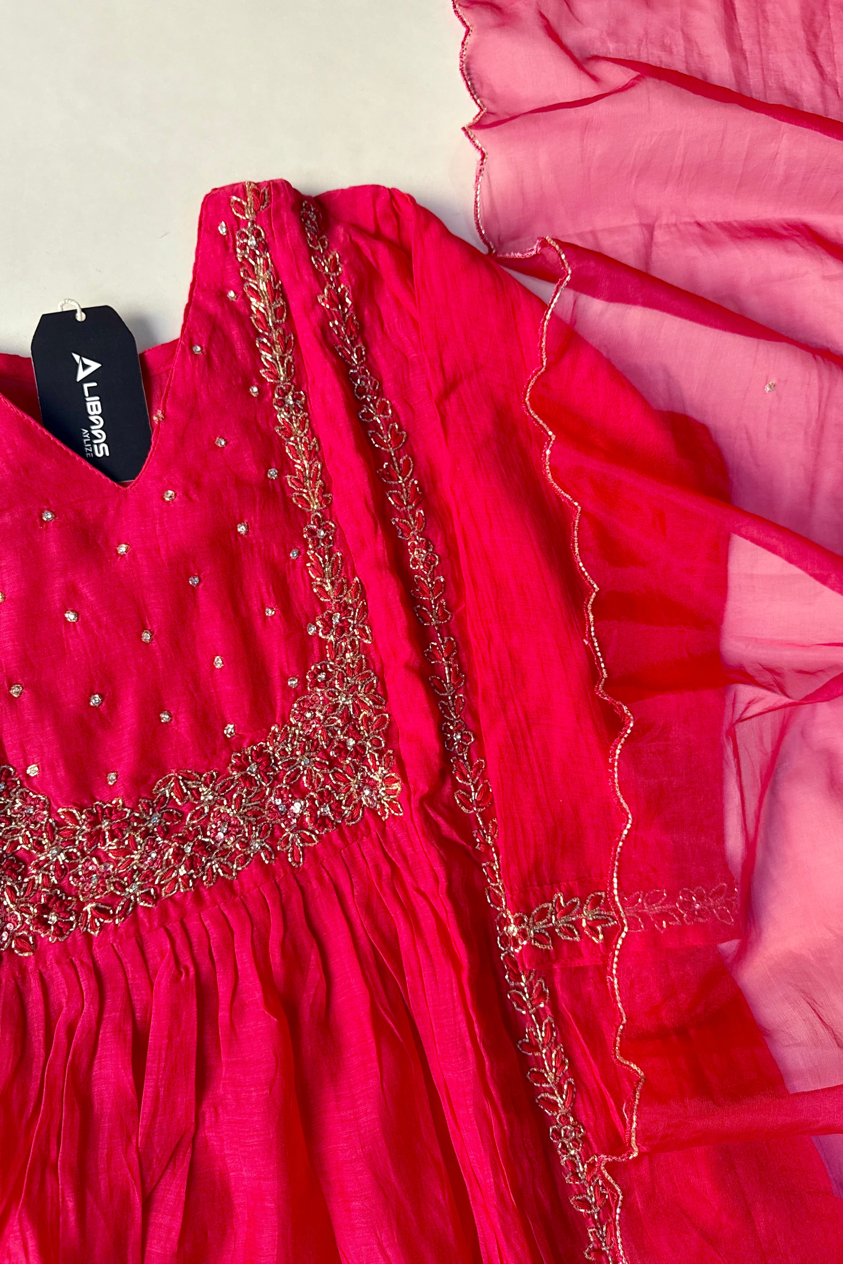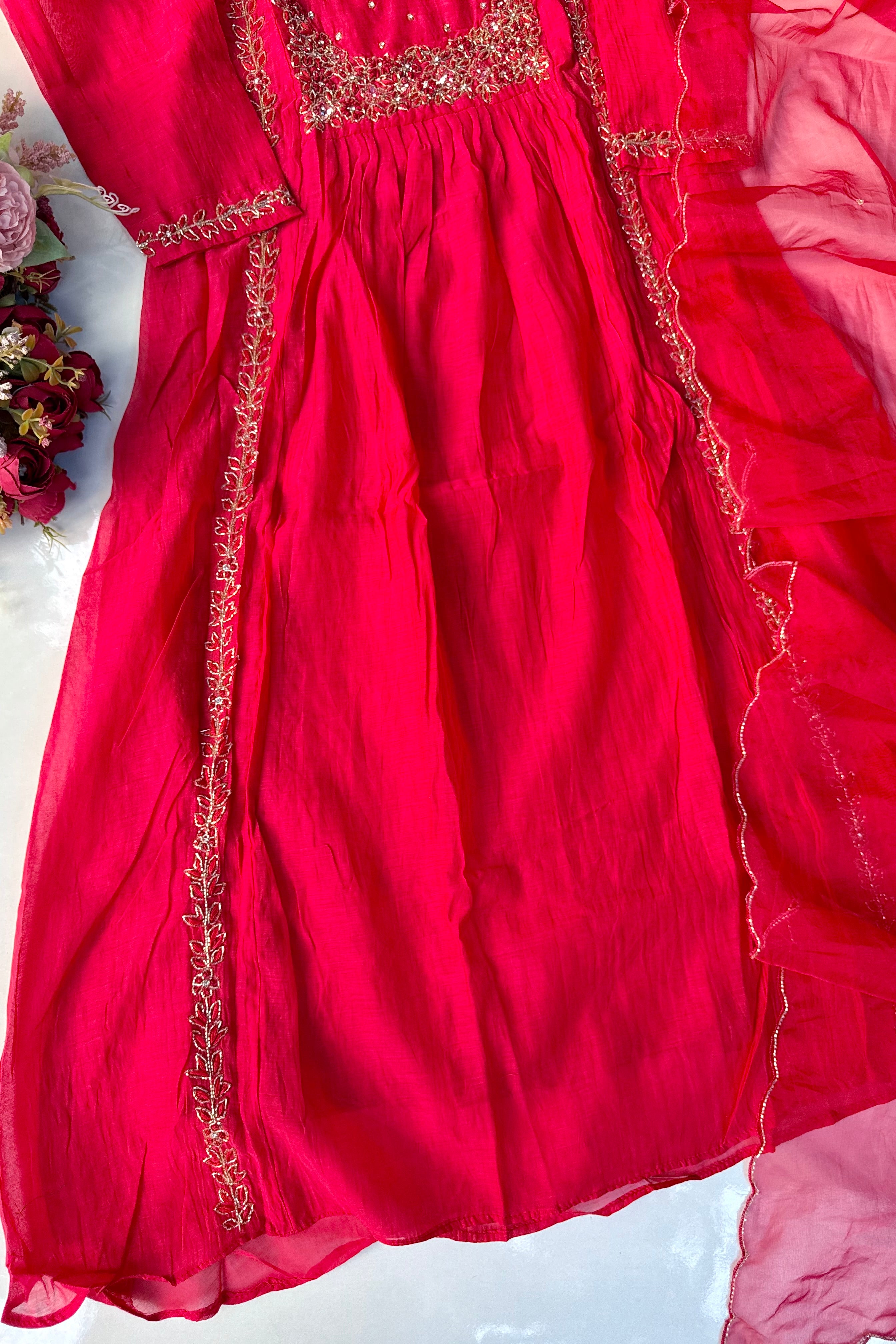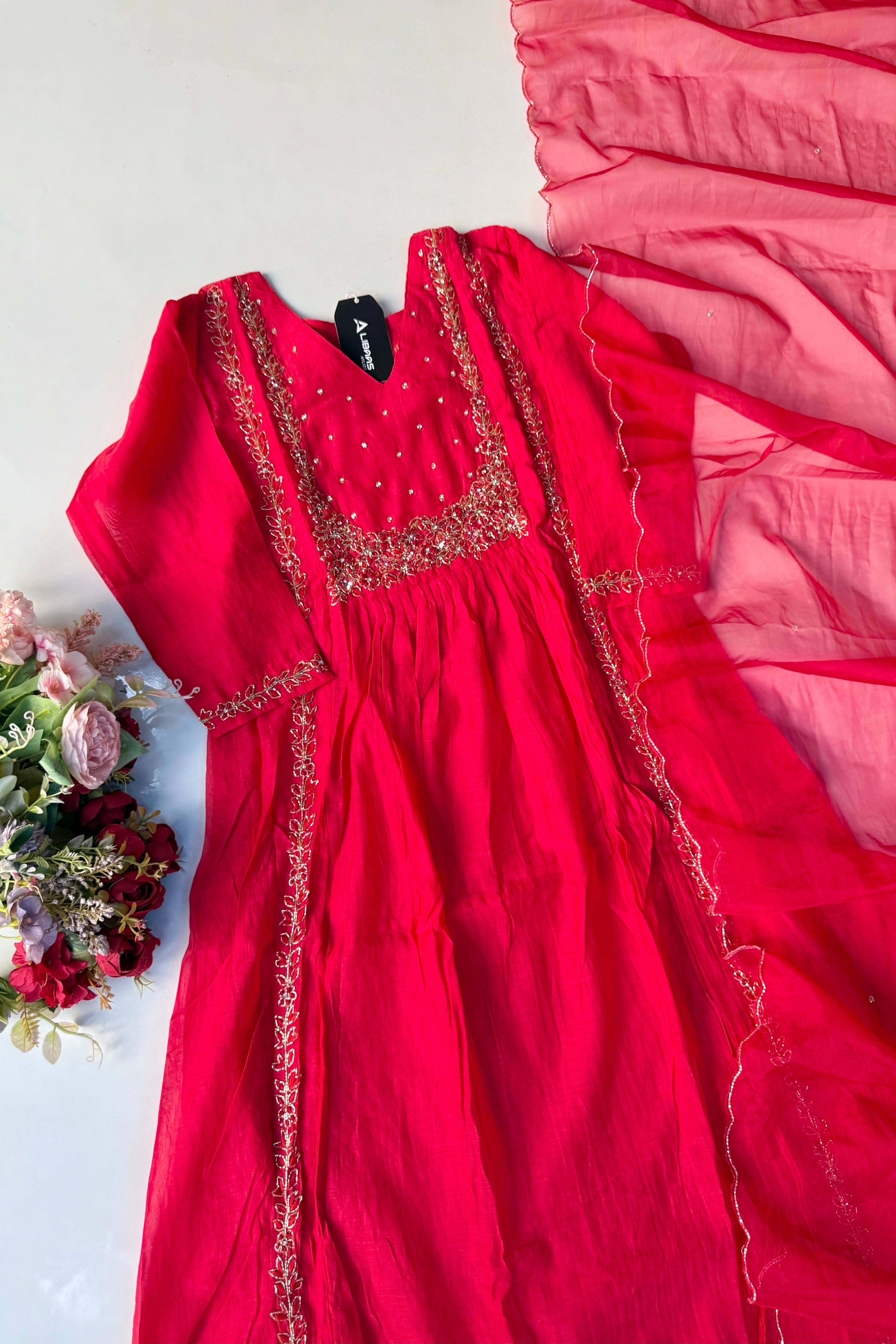 Premium Mul Chanderi Anarkali kurta set with heavy handwork on the neck line sleeve & daman of the top with a long 4side scaling organza viscose dupatta paired with mul chanderi bottom