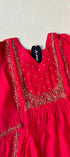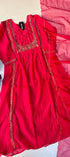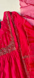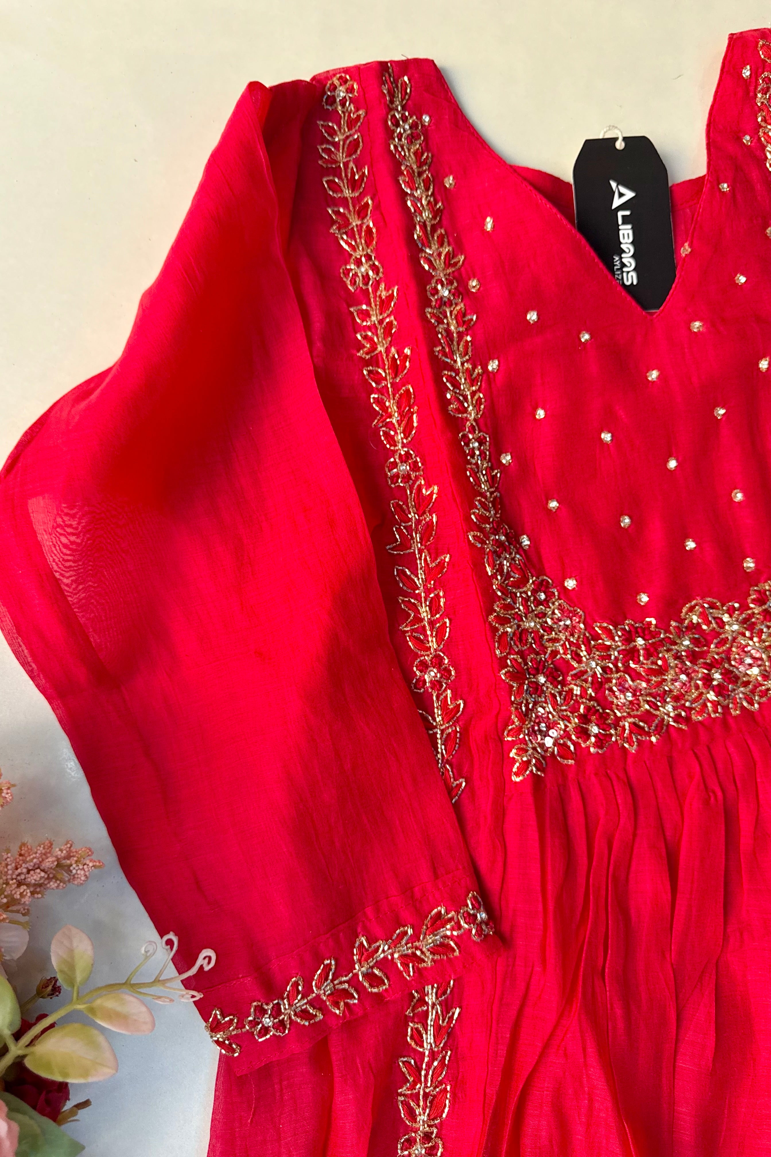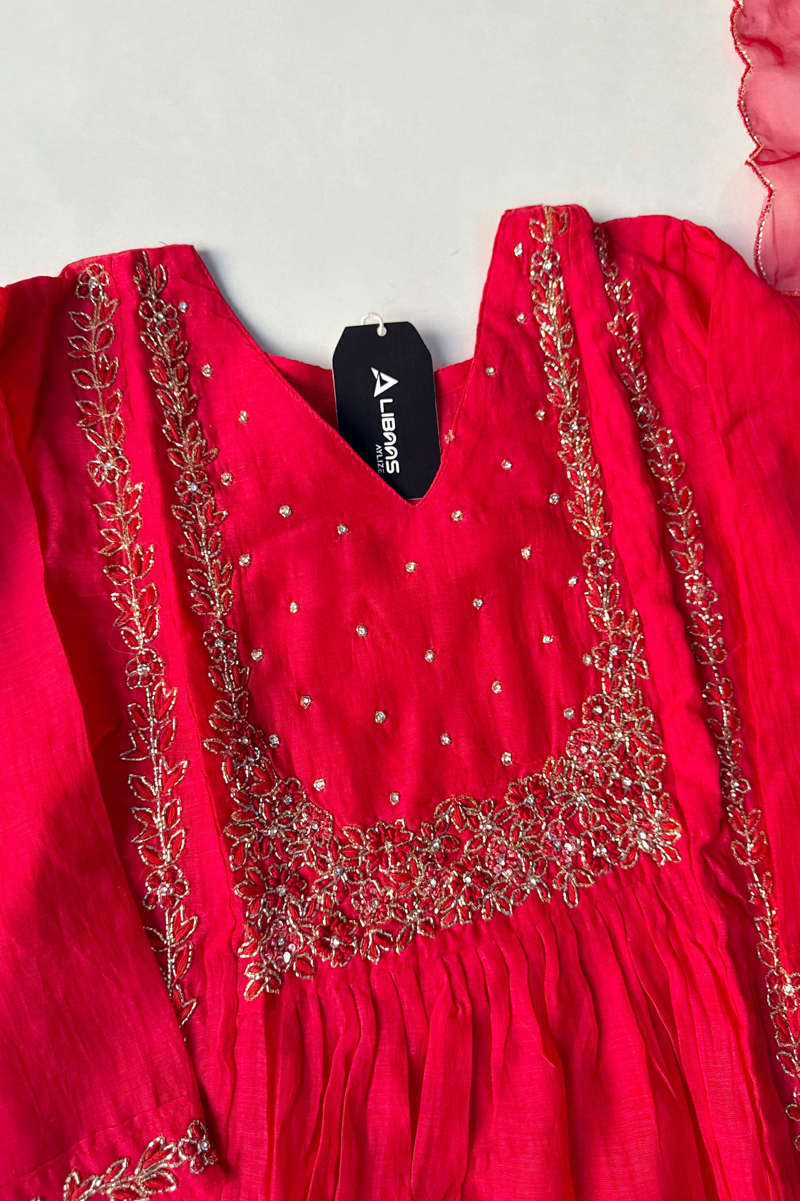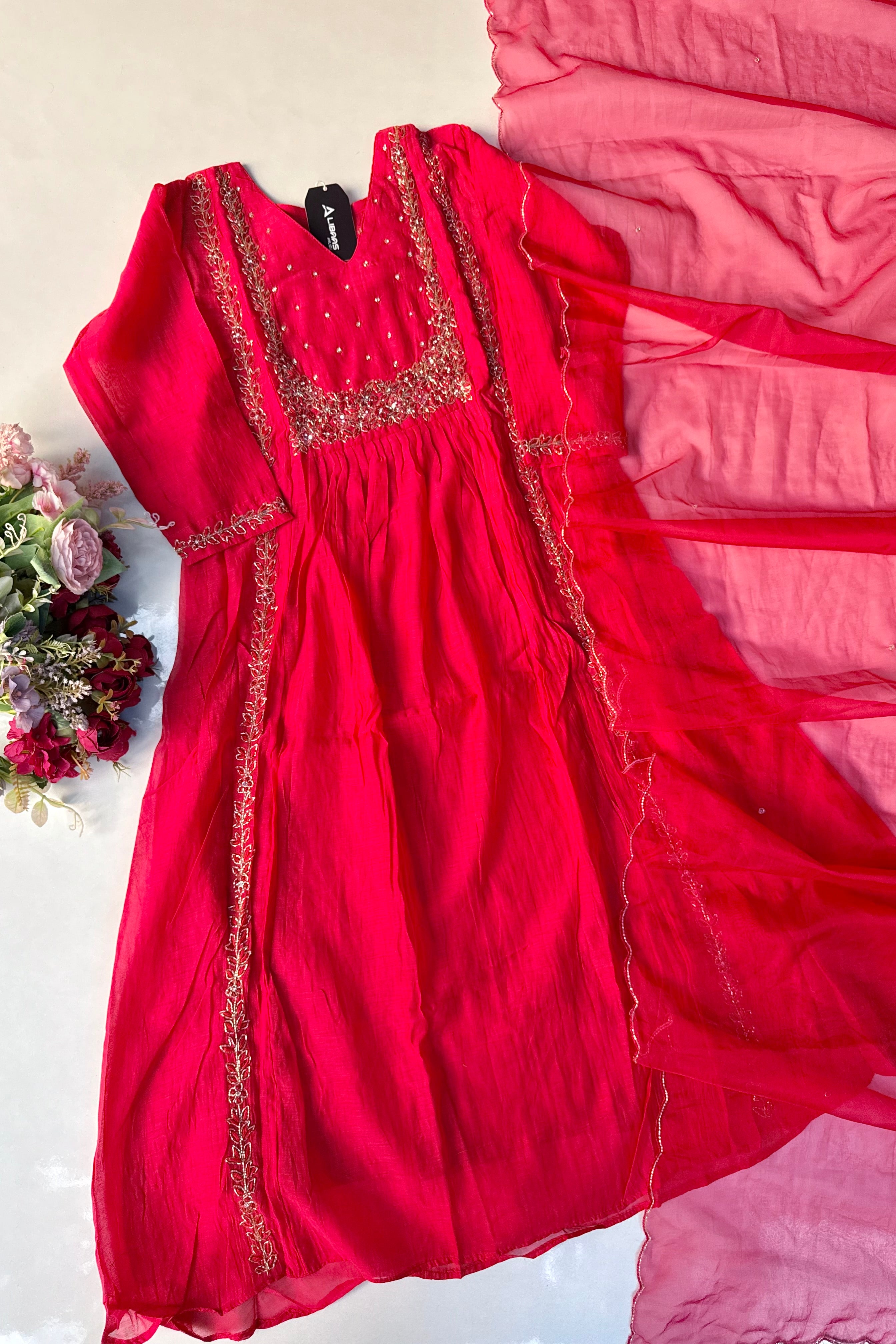 Premium Mul Chanderi Anarkali kurta set with heavy handwork on the neck line sleeve & daman of the top with a long 4side scaling organza viscose dupatta paired with mul chanderi bottom
