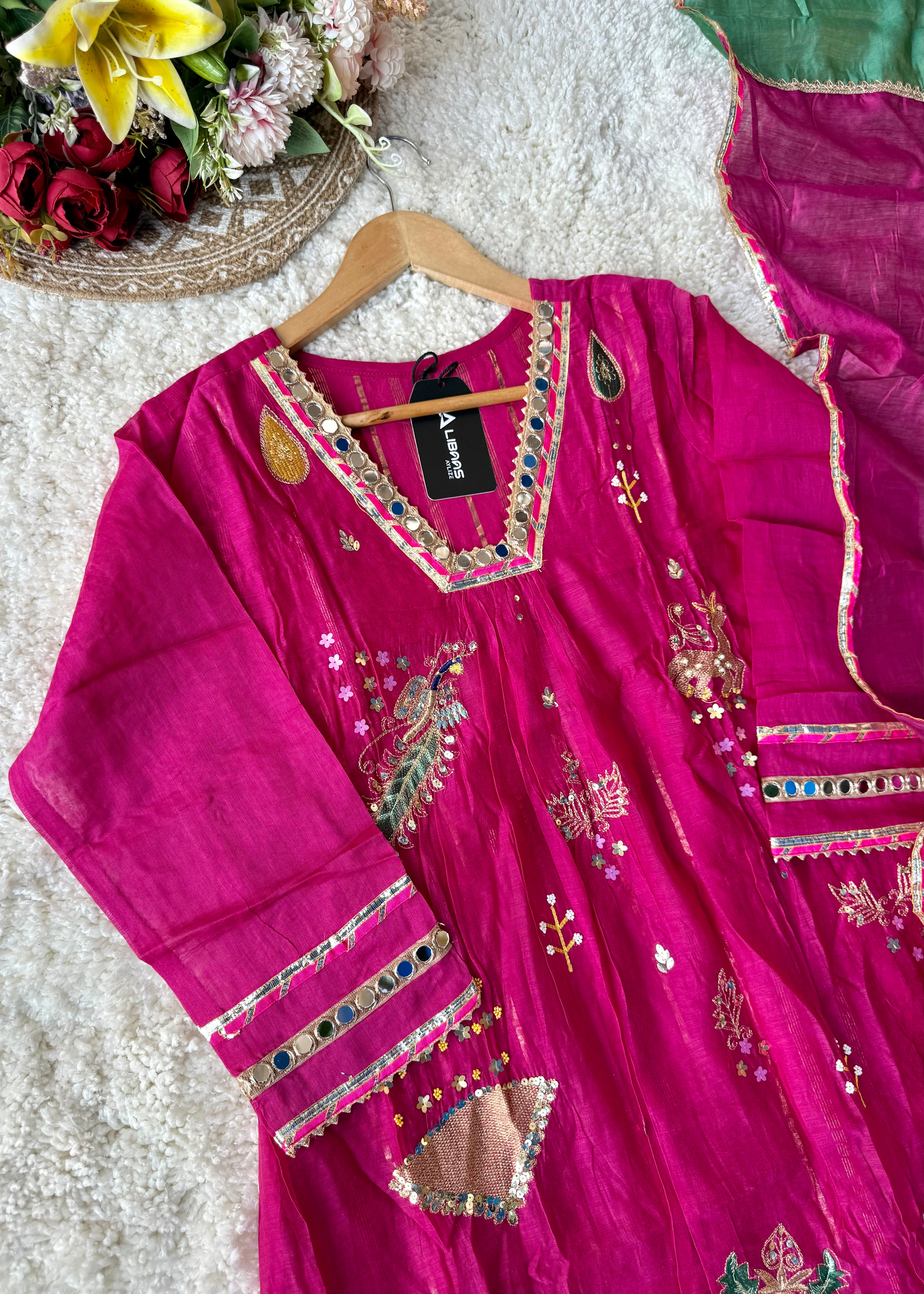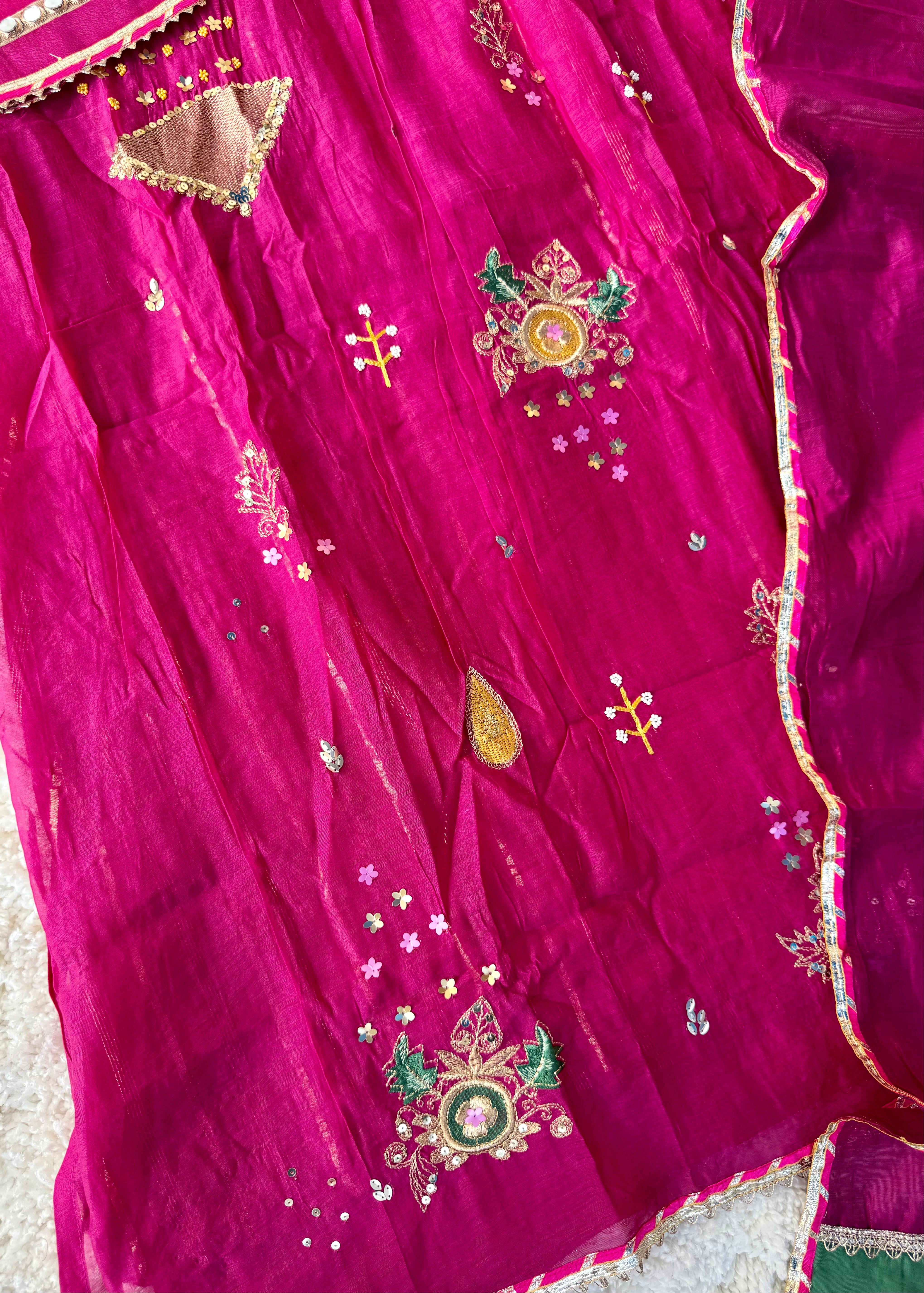 A luxurious Mul Chanderi suit set in a rich fuchsia shade, beautifully adorned with hand-embroidered motifs, zari detailing, mirror work and contrast finishing. Paired with a matching bottom and a contrast mul chanderi dupatta for an elegant festive look.