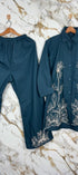 Elegant co ord set crafted in premium Dola Silk fabric, featuring delicate thread embroidery on the front and hem.