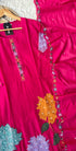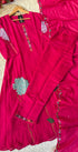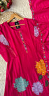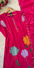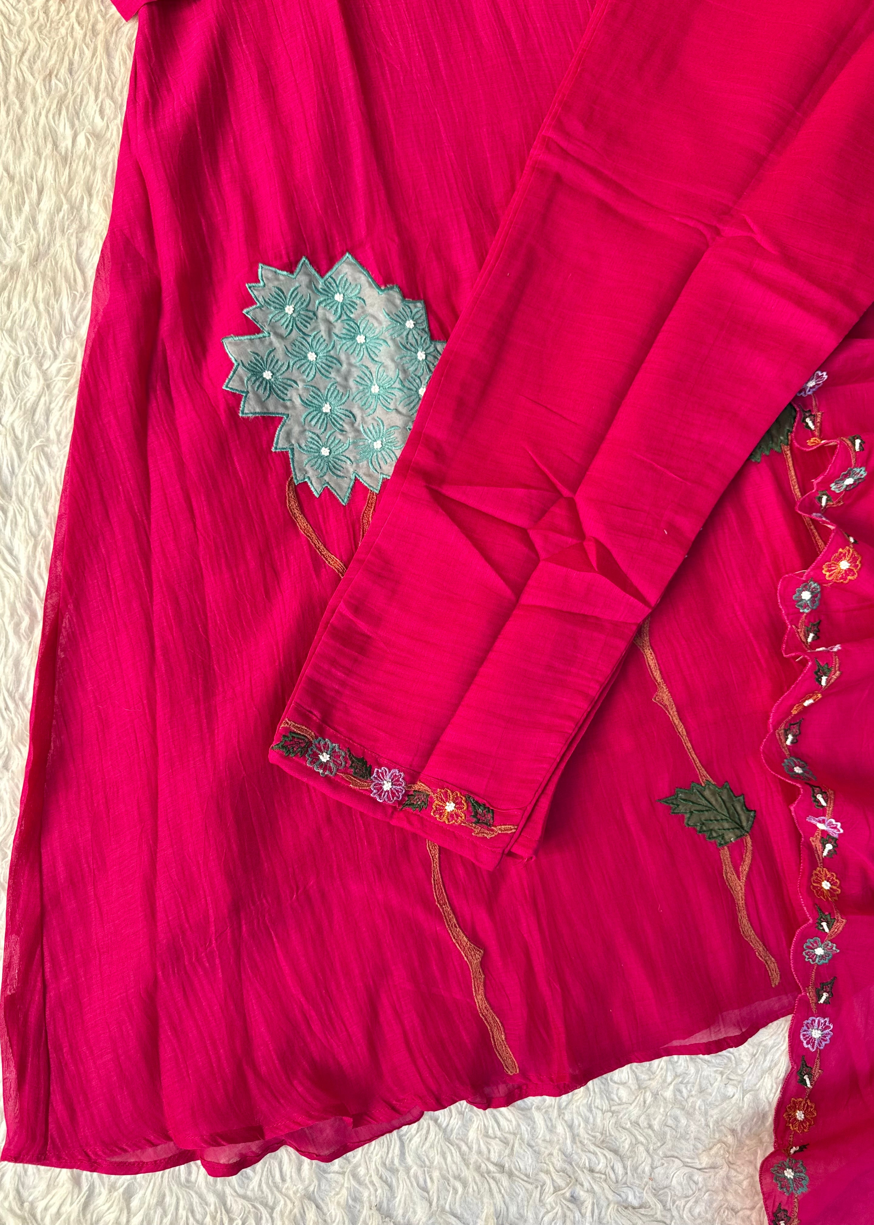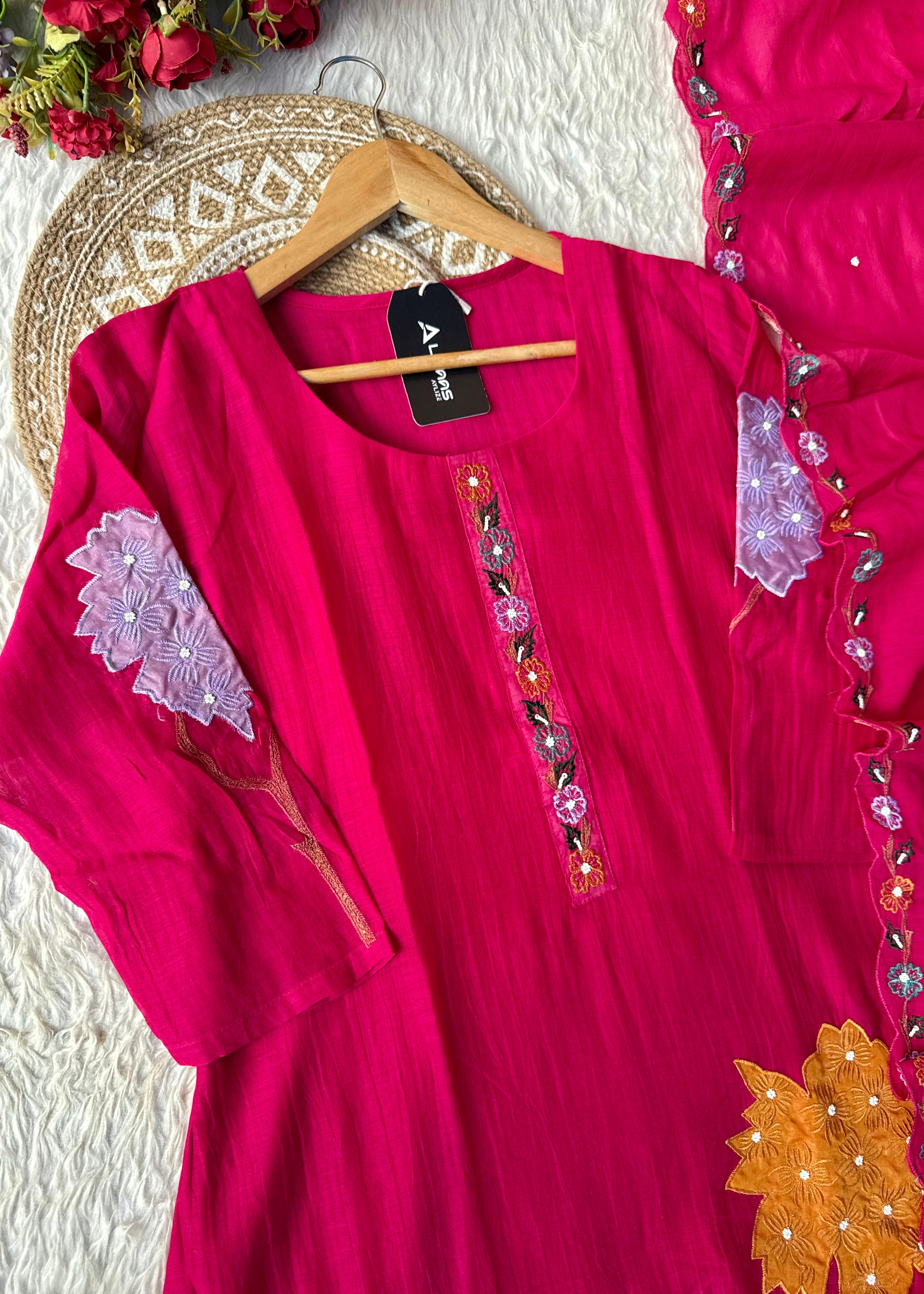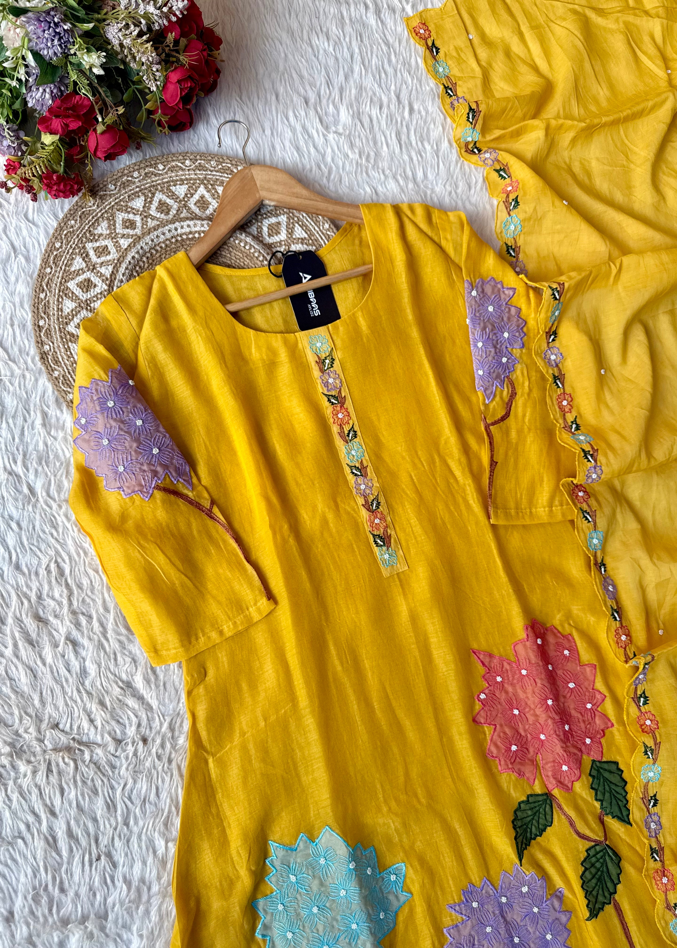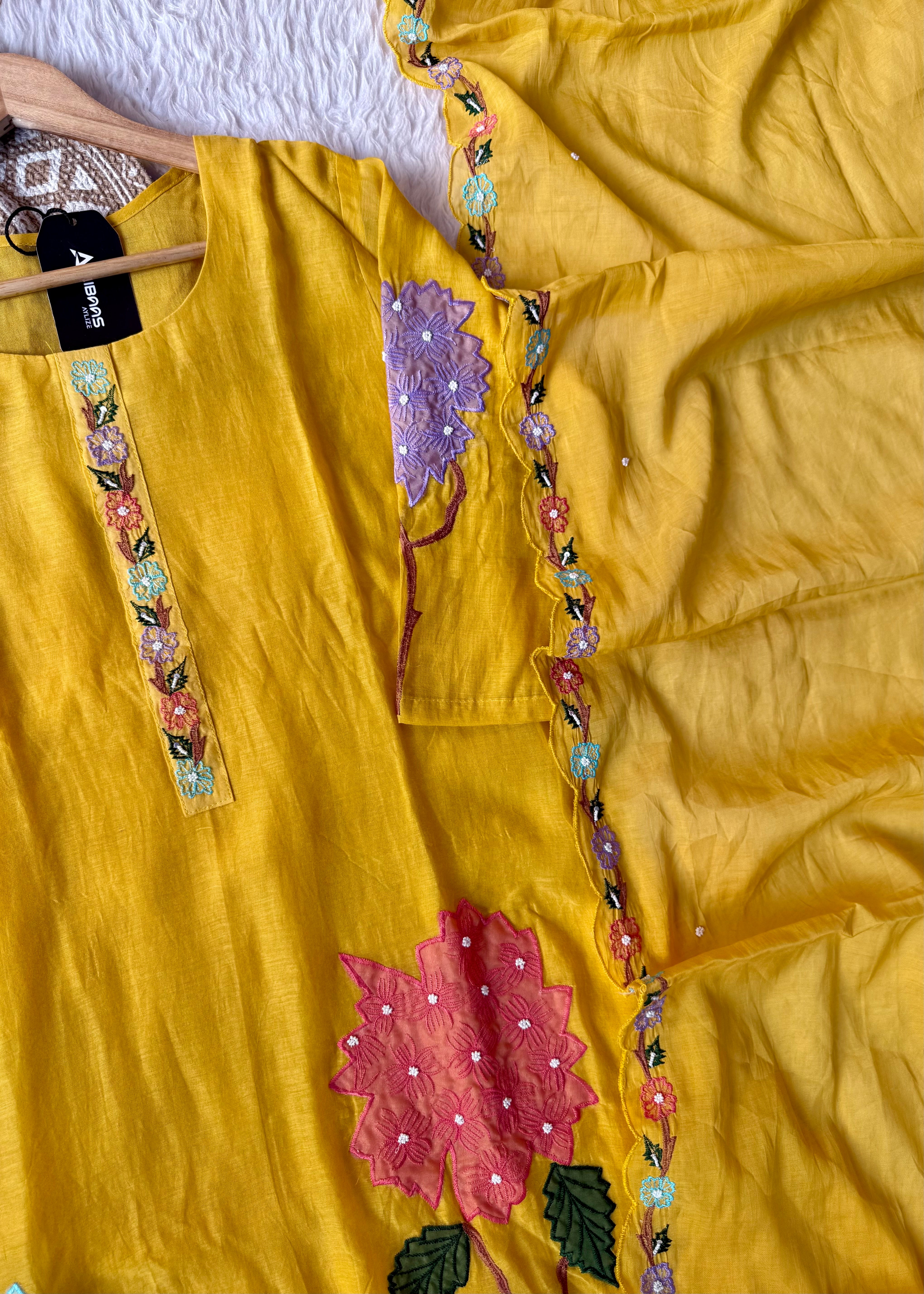 This set features a soft Mul Chanderi fabric, beautifully highlighted with 3D appliqué floral work, fine thread embroidery, and a flowy A-line silhouette.