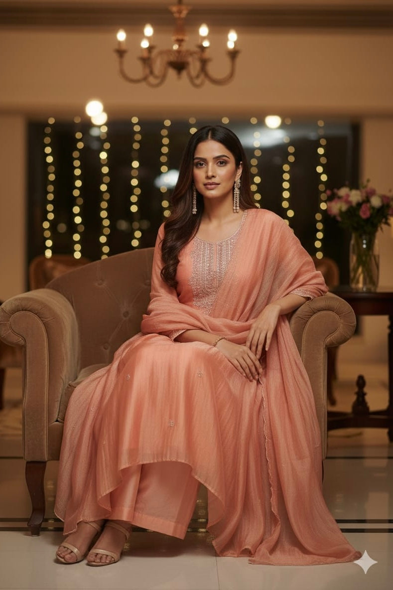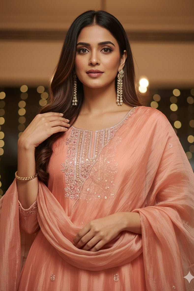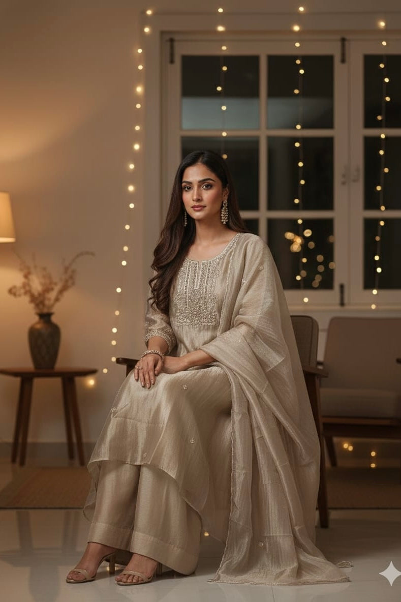 A luxurious Glass Tissue Kurta Set designed for elegant festive, wedding and party occasions. Lightweight, premium shine, and beautifully hand-detailed—perfect for women who love sophisticated ethnic fashion.