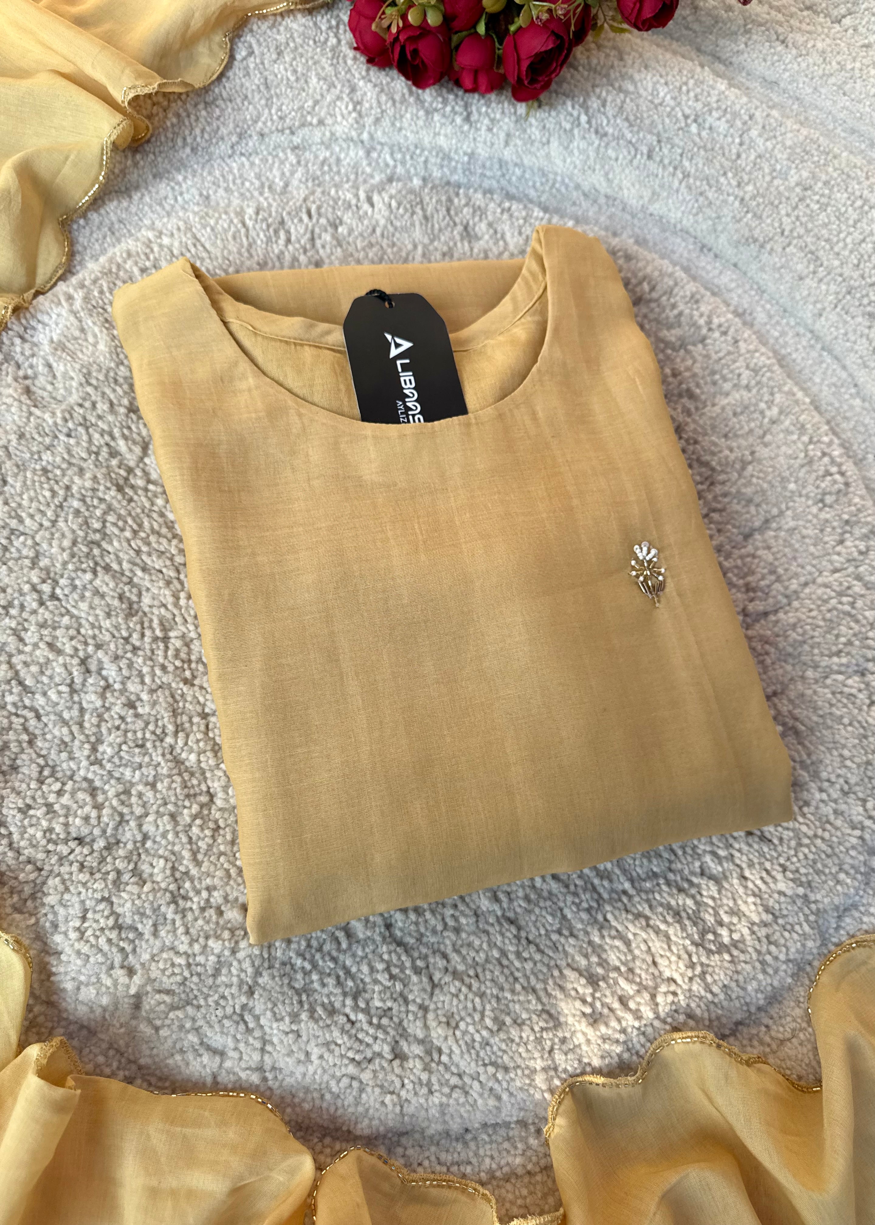 Beautiful premium mul chanderi kurti with Beautiful handwork attached all over the top with mul cotton lining, comfortable mul chanderi pants with cotton lining and full length soft mul chanderi dupatta covered with beautiful hand work.