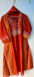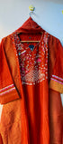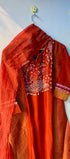 Elevate your ethnic wardrobe with this elegant Mul Chanderi straight kurta set. Designed in a rich deep red color, the kurta features intricate handwork embroidery on the neckline and sleeves, paired with a matching bottom. The set is completed with a contrast organza dupatta adorned with golden woven stripes and a delicate lace border, making it perfect for festive occasions, weddings, and parties