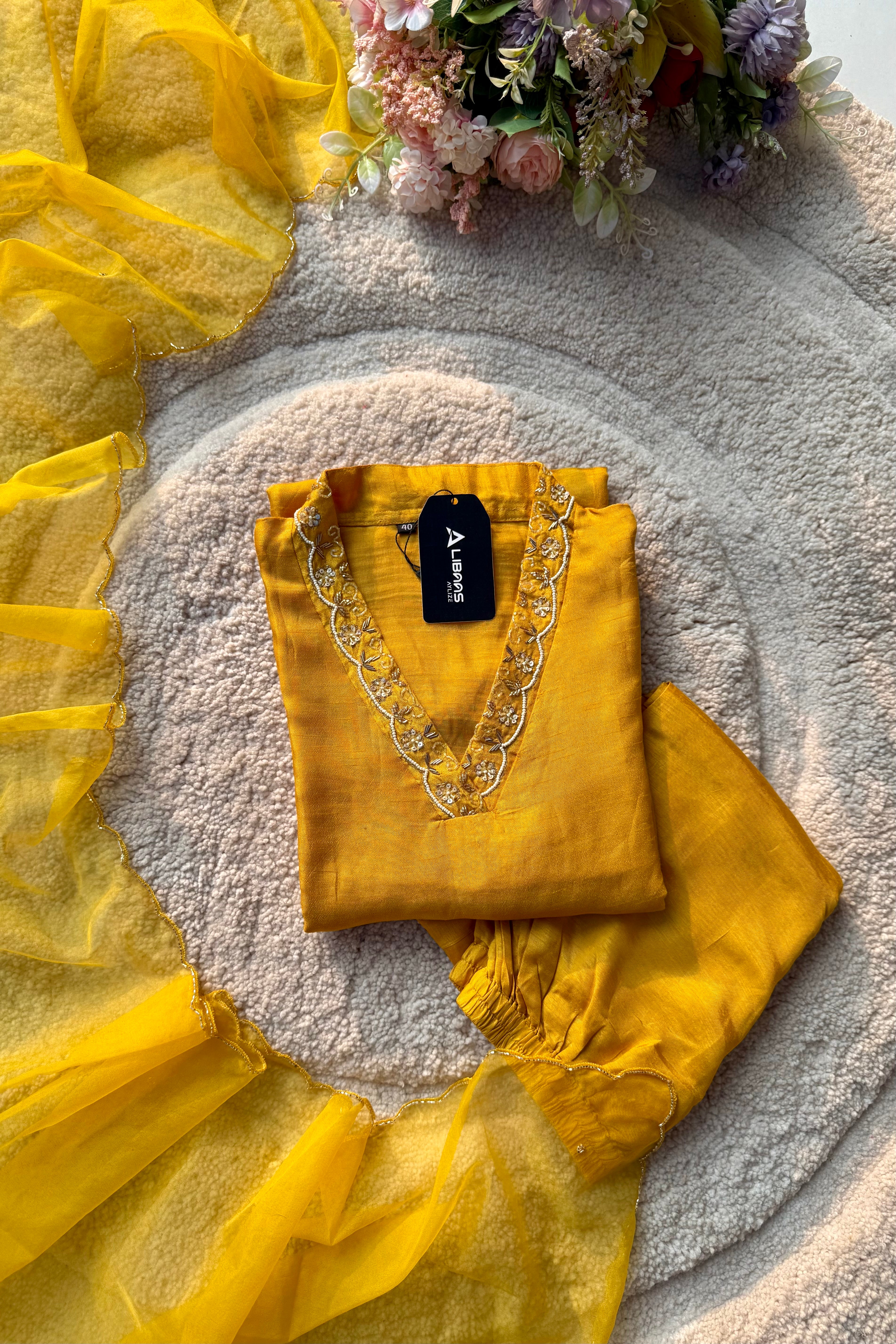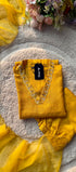 Aylize Bring timeless elegance to your festive wardrobe with this replay silk suit set. The Dola silk kurta is beautifully crafted with hand work, featuring intricate floral motifs that add a regal charm. Paired with matching Dola silk bottom and a viscose dupatta finished with delicate embroidery and scalloped edges, this outfit is perfect for weddings, festivals, and special celebrations.