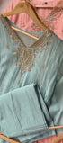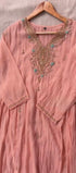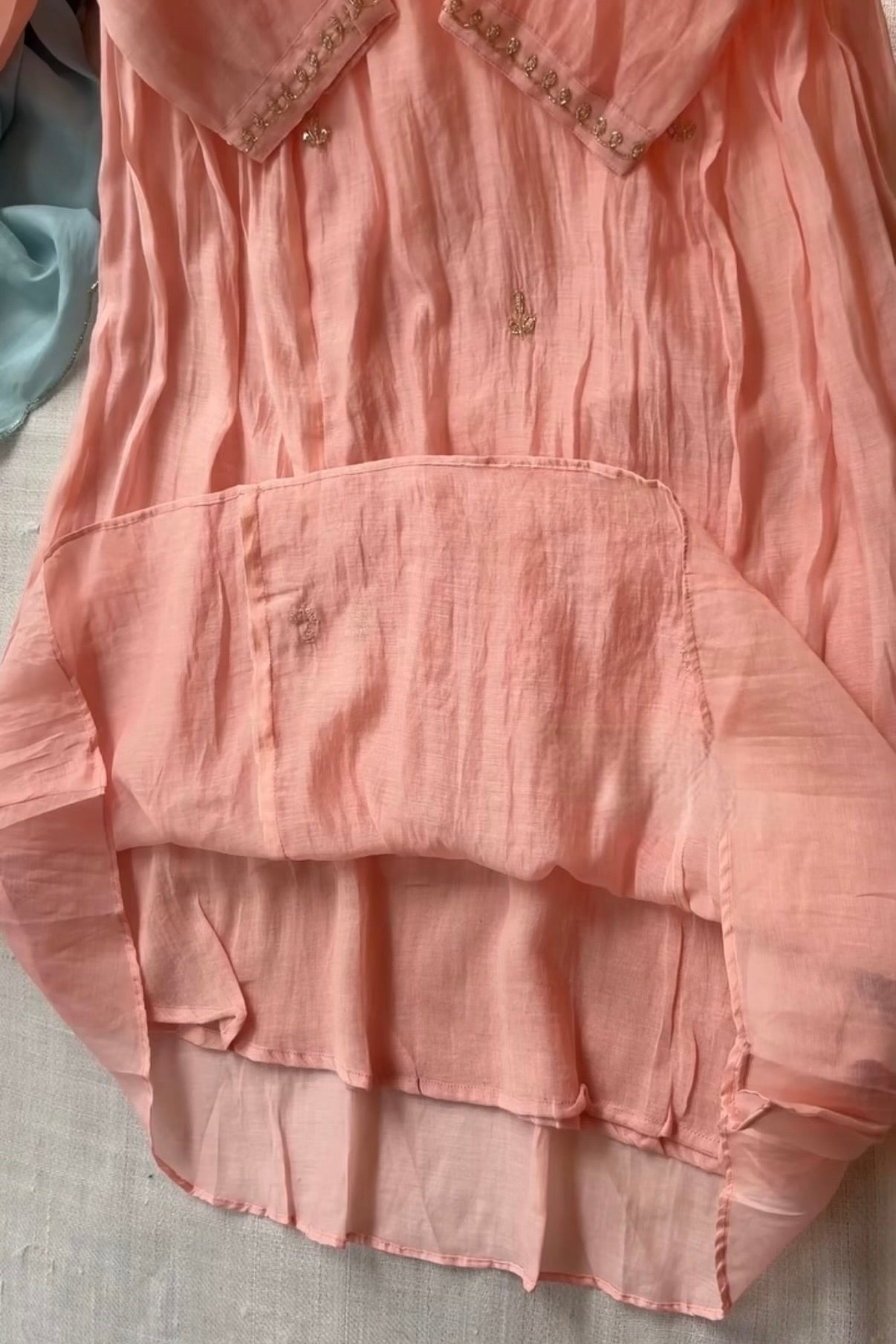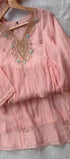 Beautiful premium mul chanderi kurti with zari and kadh dana work attached with mul cotton lining, comfortable mul chanderi pants with cotton lining and full length soft mul cotton dupatta covered with beautiful zari work.