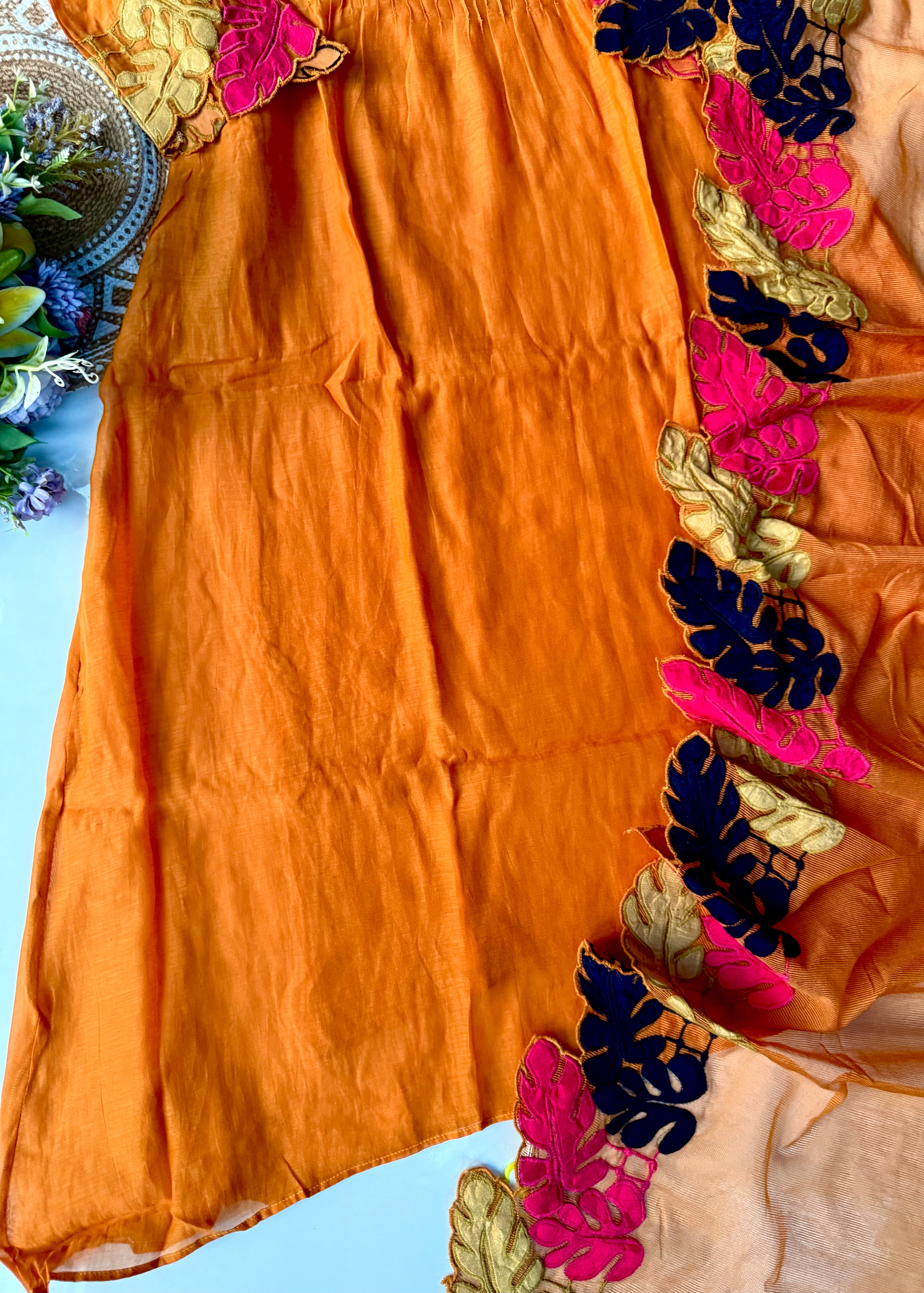 “Kashish” Golden Mustard Mul Chanderi Multicolor Leaf Applique A Line Suit 🛍️