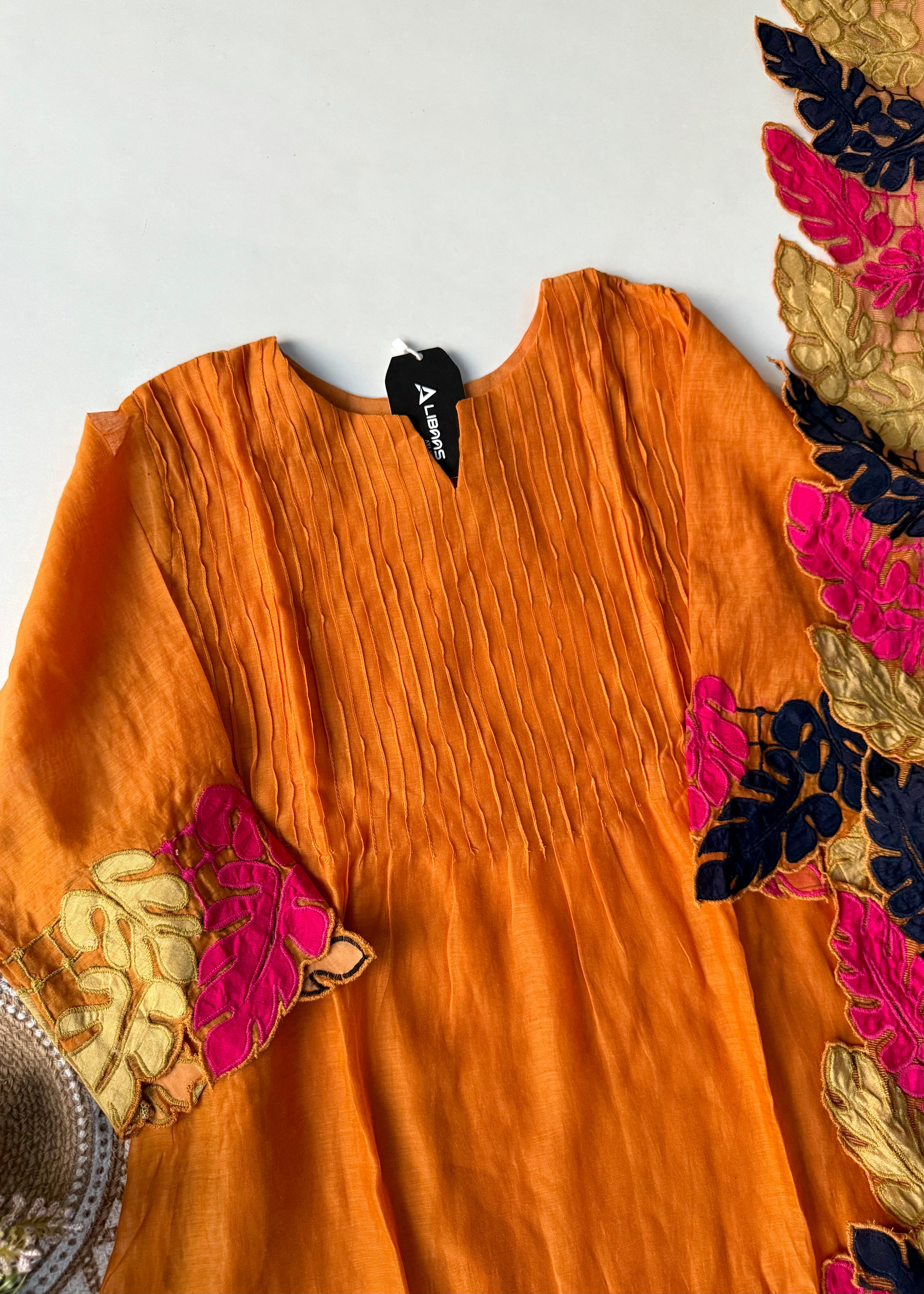 Featuring fine pintucks, colorful leaf appliqué work, and a soft mul chanderi dupatta — perfect for festive gatherings and traditional celebrations.