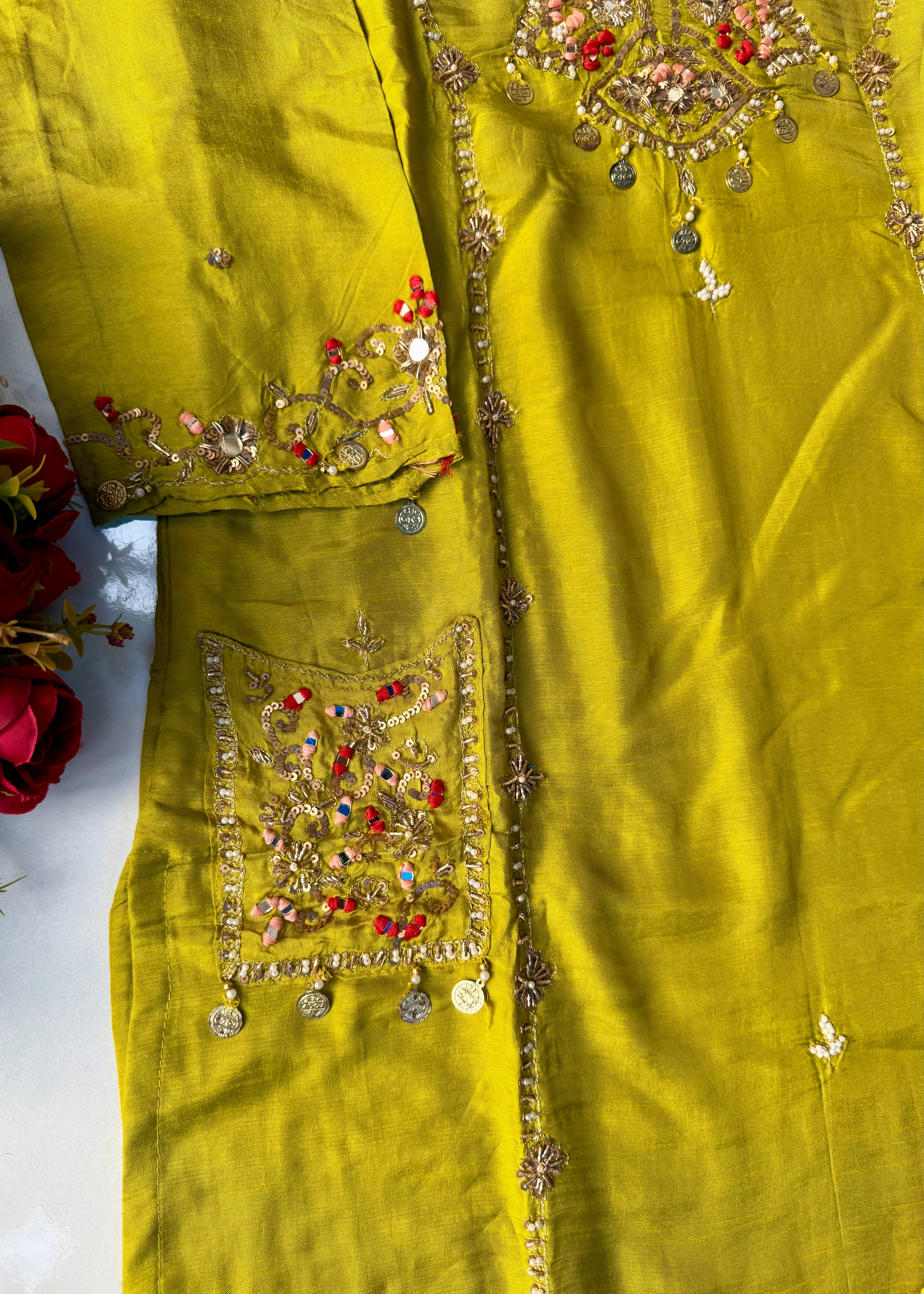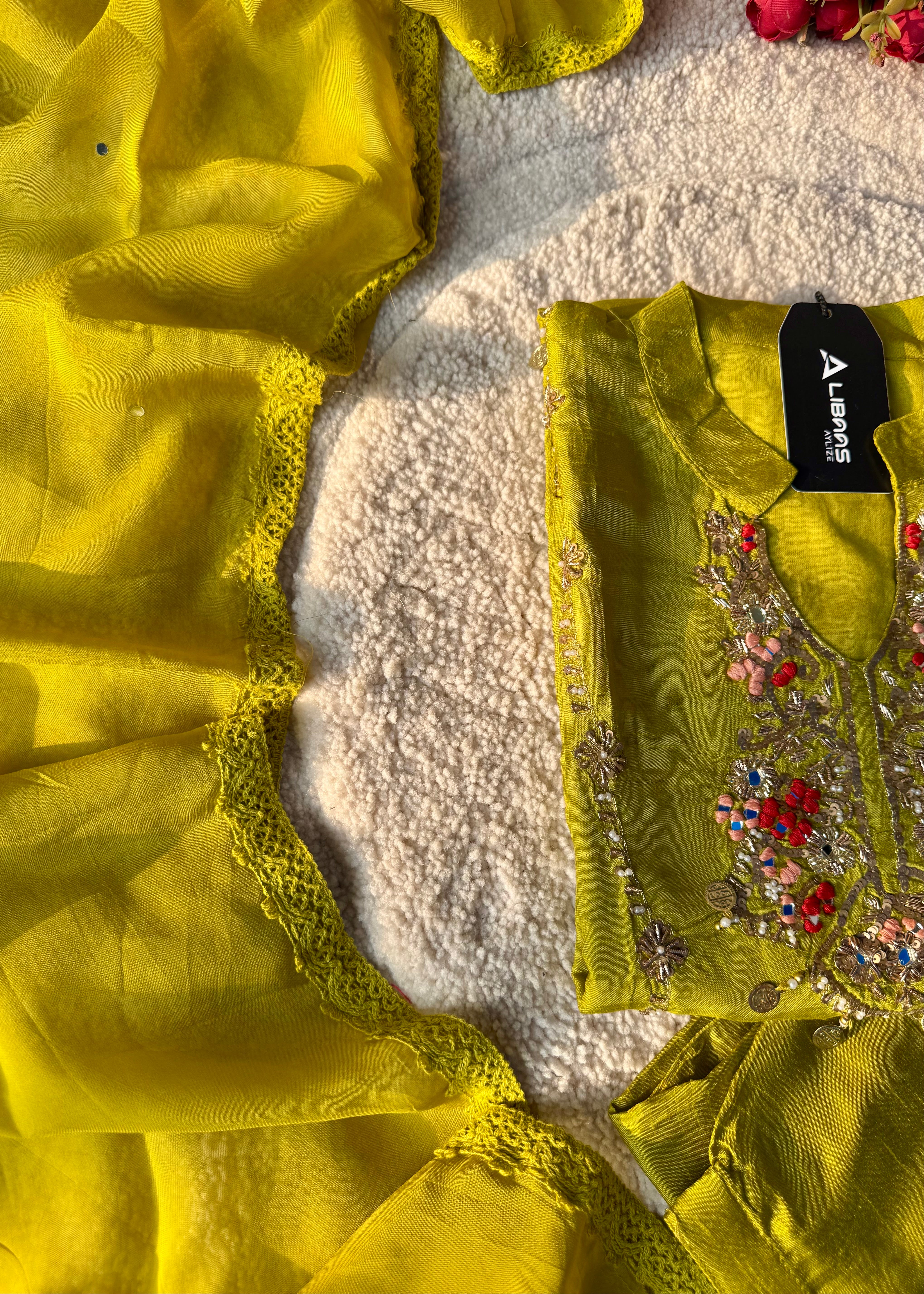 “Lime” Greenish Yellow Dola Silk Heavy Handwork Suit Set