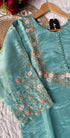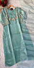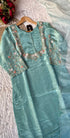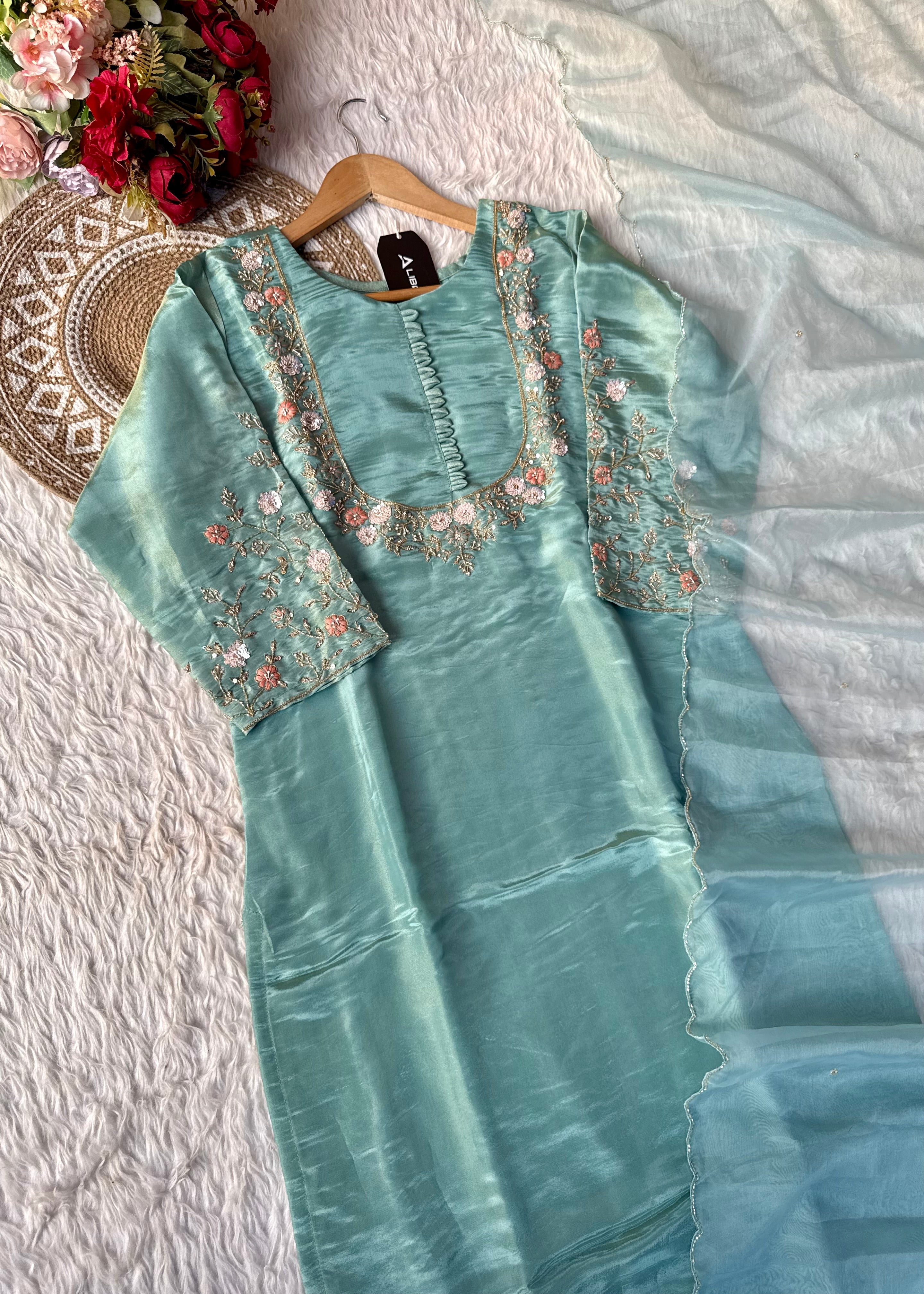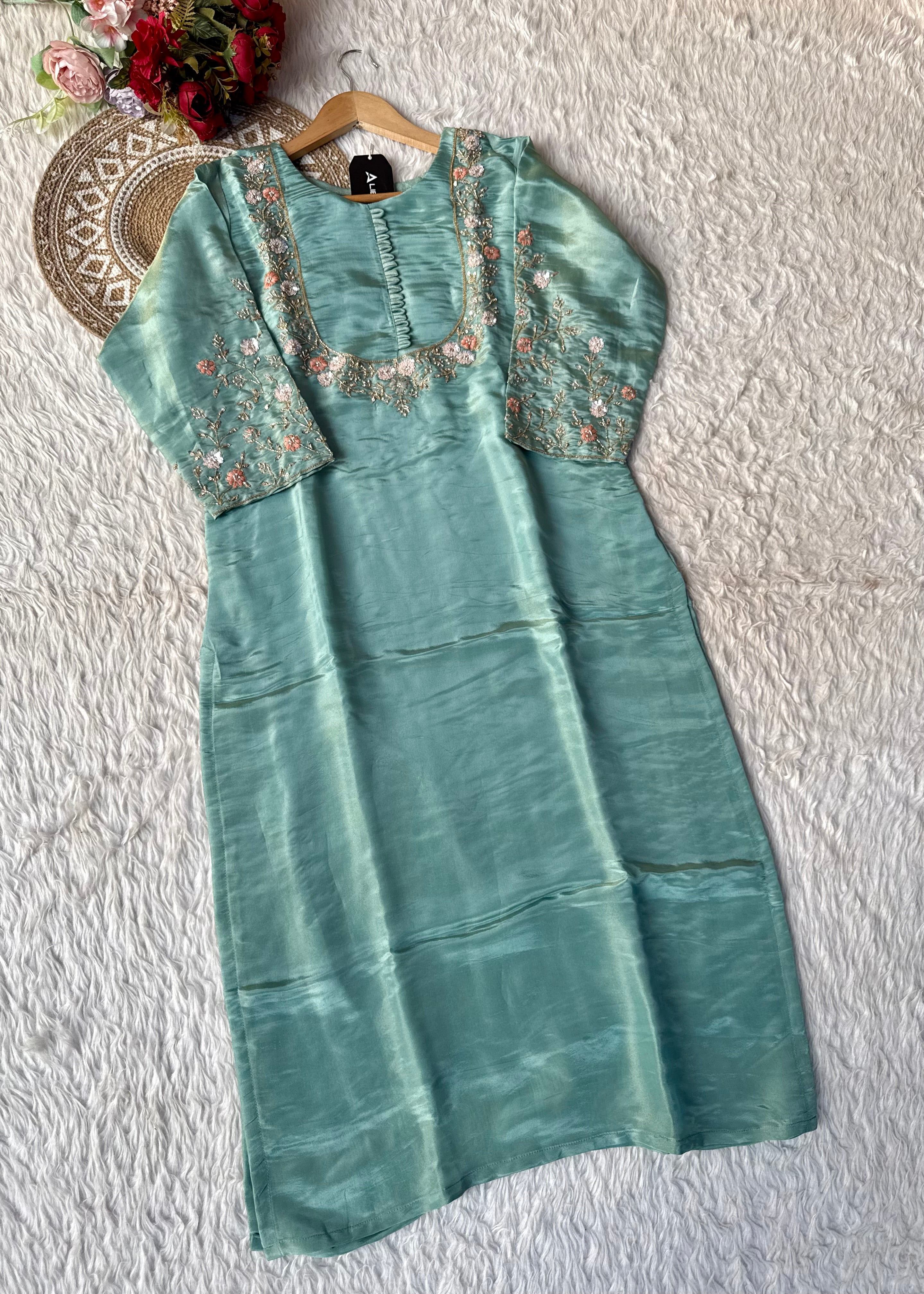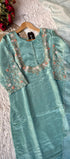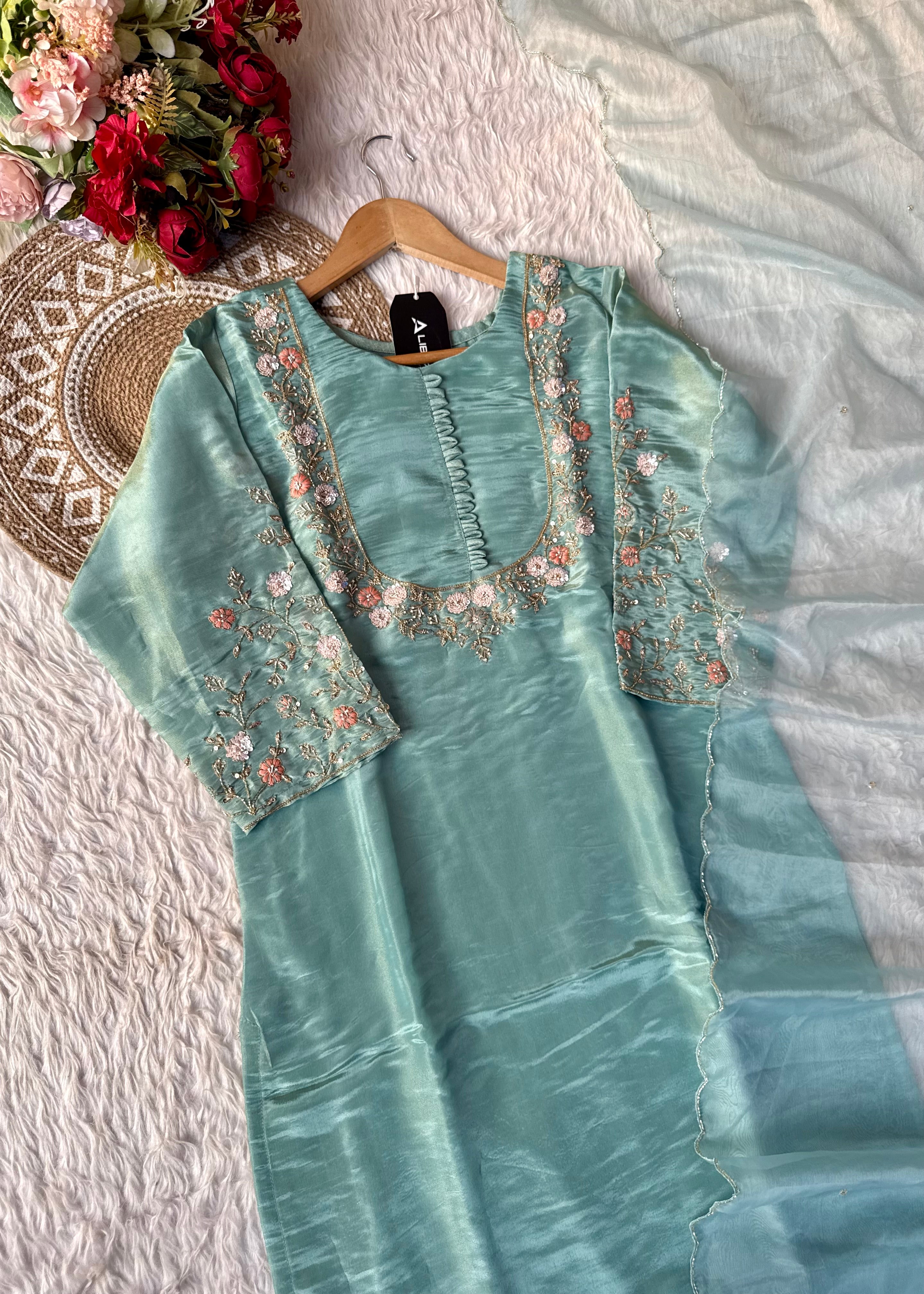 Premium tissue silk kurti with handwork on the yoke & sleeve of the top with a long Weaving organza dupatta with paired with a plane silk bottom with pockets