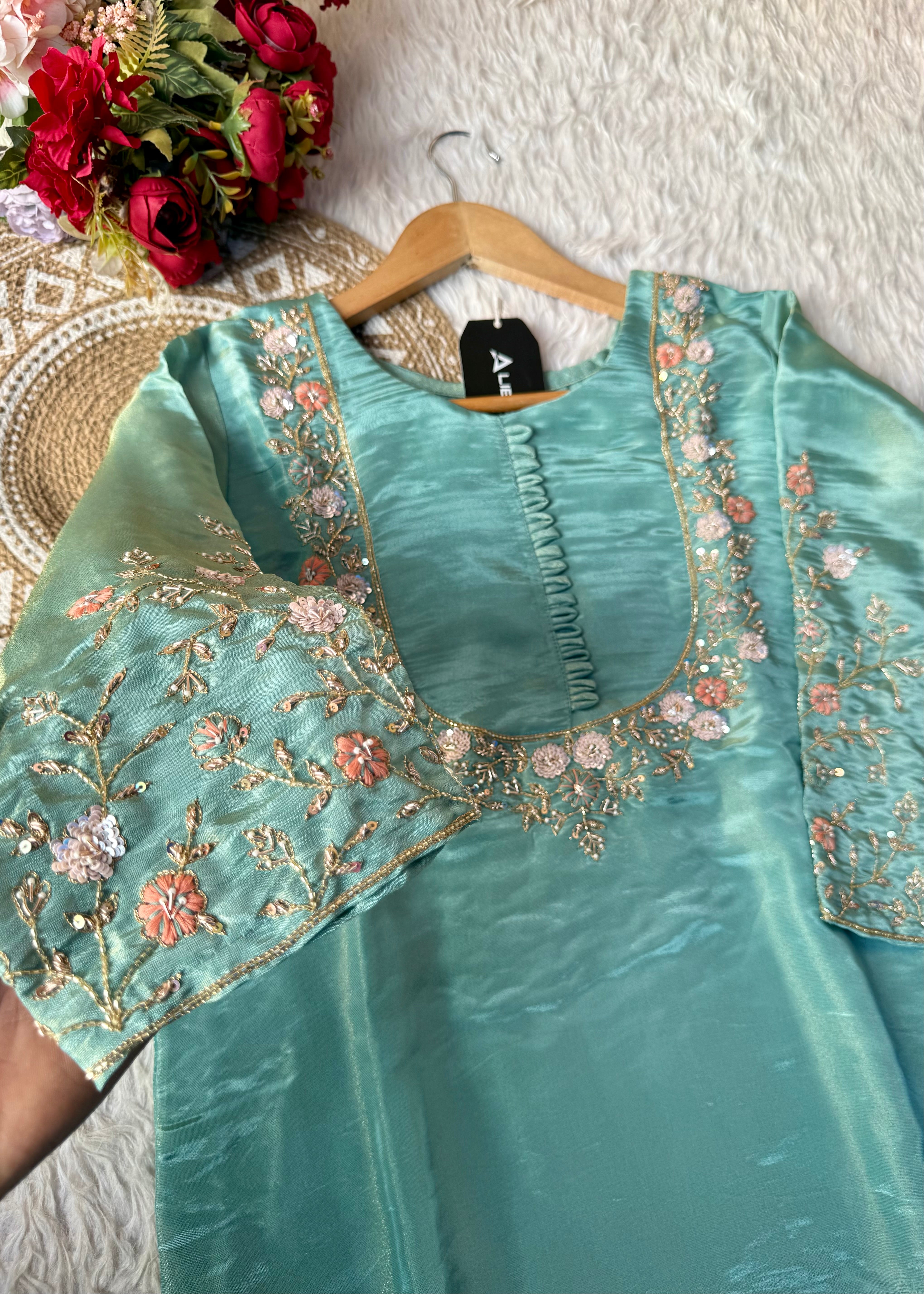 “Naayaab” Premium Pista Green Tissue silk handcrafted kurta set