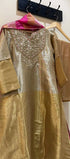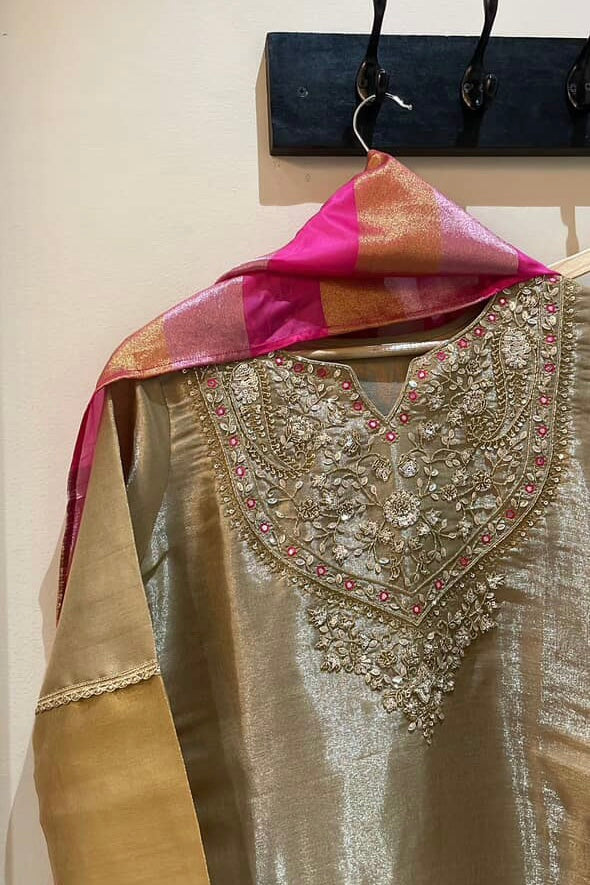 Glow like gold this festive season - A-line shimmer tissue suit with exquisite handwork detailing