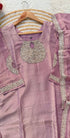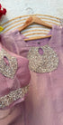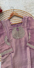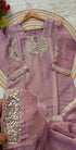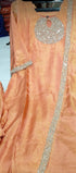 Beautiful brown with gold tone shimmer tissue kurta set with intricate handwork on the yoke and sleeve with a heavy handwork scallop viscose organza dupatta paired with a plane silk bottom