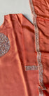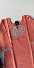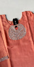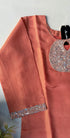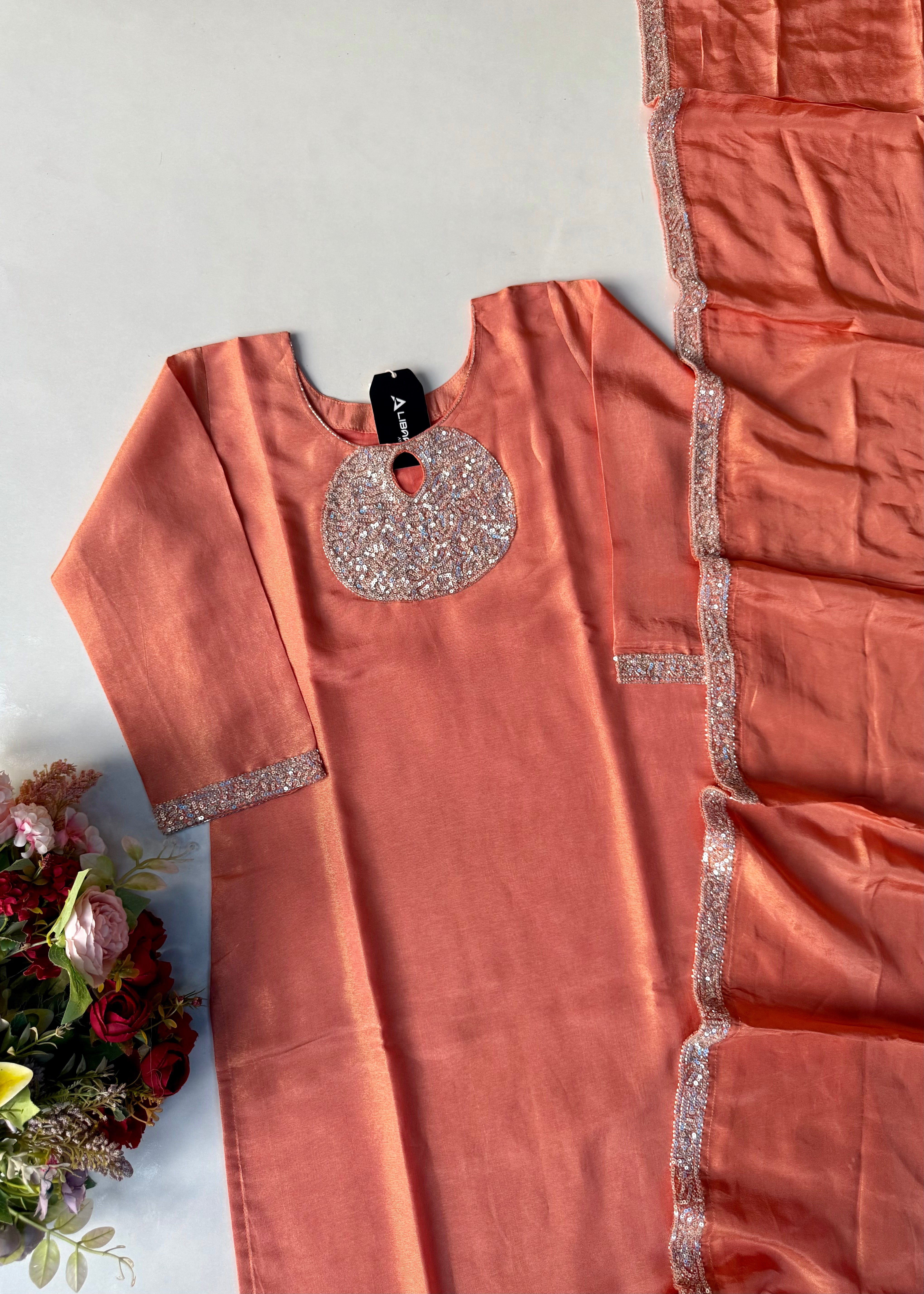 Beautiful Peach with gold tone shimmer tissue kurta set with intricate handwork on the yoke and sleeve with a heavy handwork scallop viscose organza dupatta paired with a plane silk plazzo
