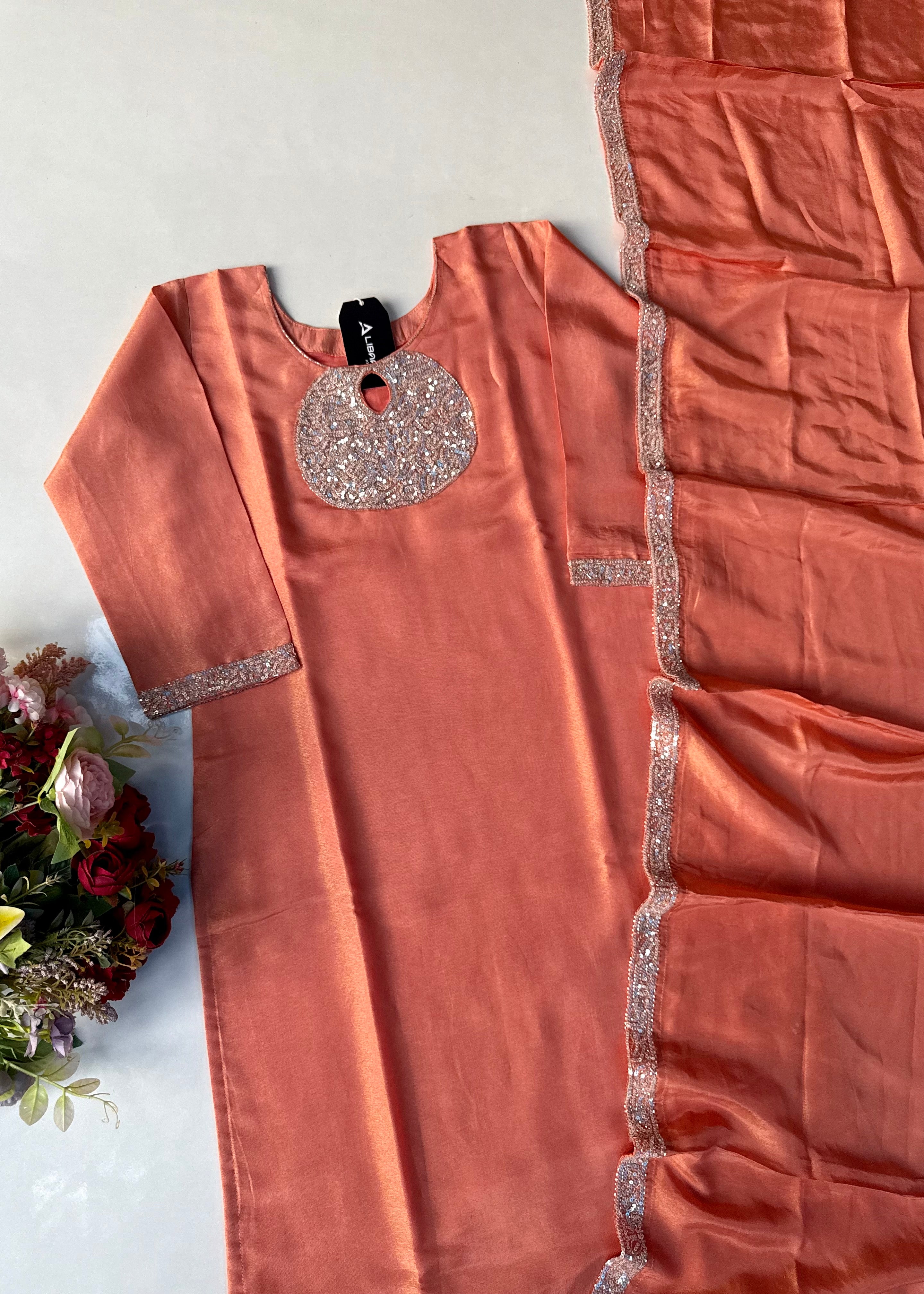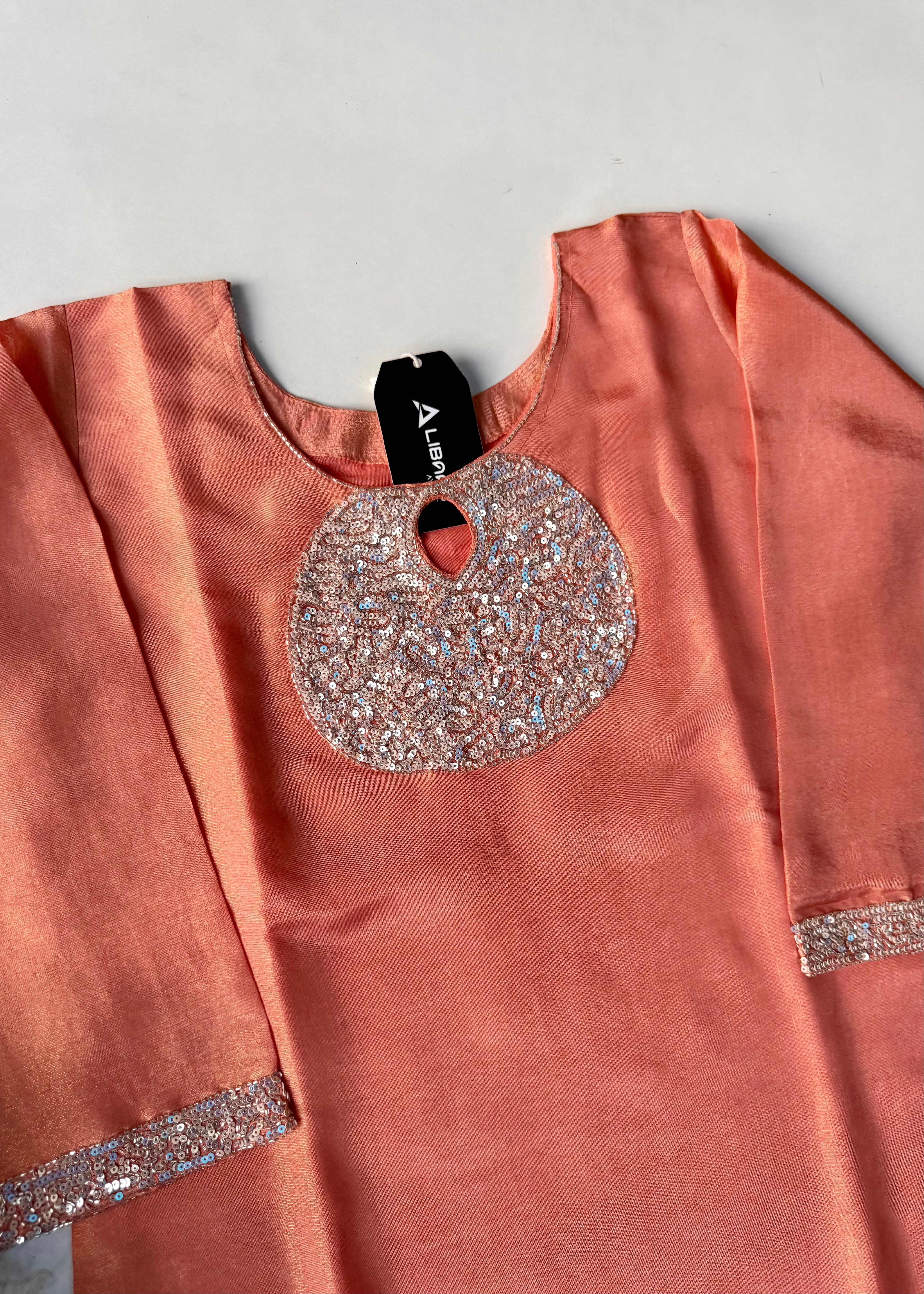 “SHINE” Beautiful Peach with gold tone shimmer tissue kurta set