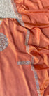 Beautiful Peach with gold tone shimmer tissue kurta set with intricate handwork on the yoke and sleeve with a heavy handwork scallop viscose organza dupatta paired with a plane silk plazzo