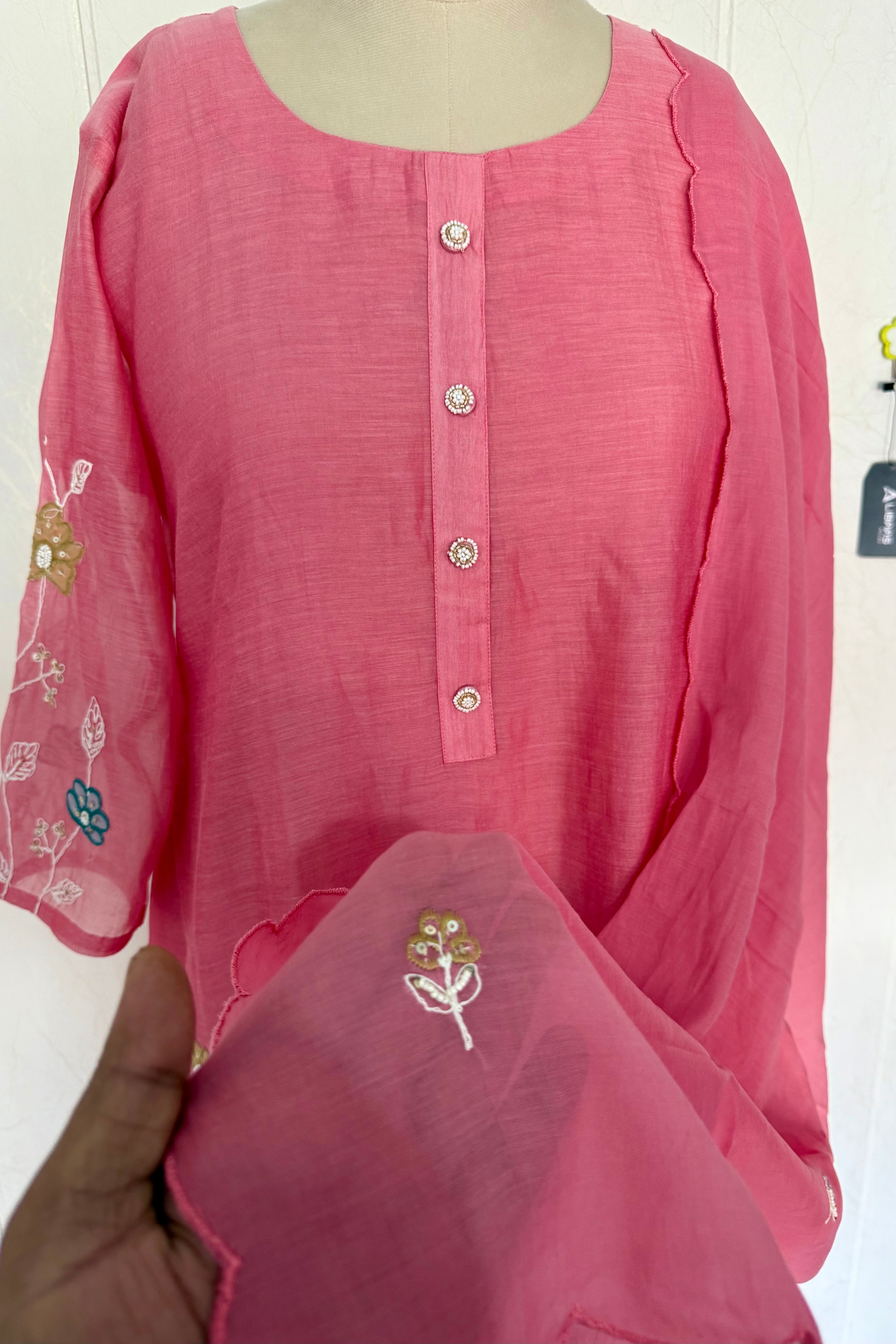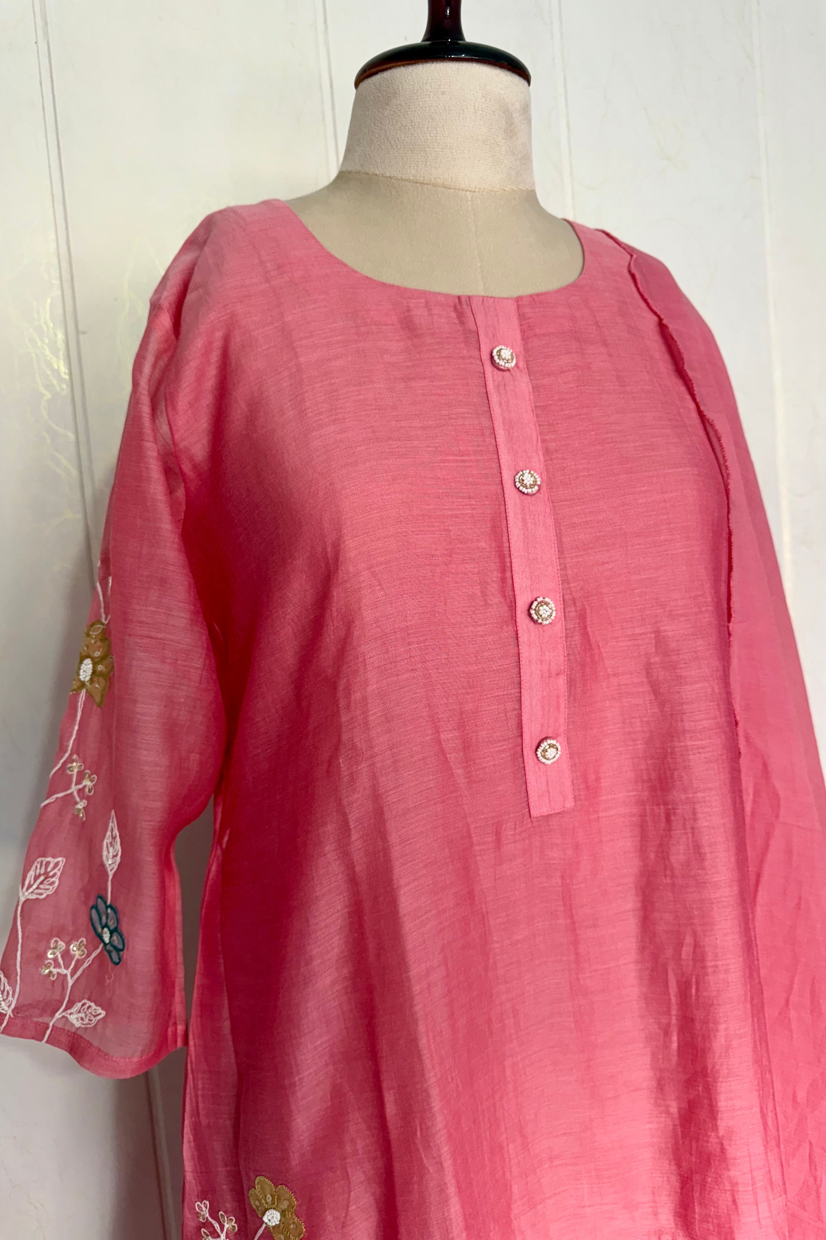 “Thread” Premium Bloom Pink Mul Chanderi A Line kurta set - XS