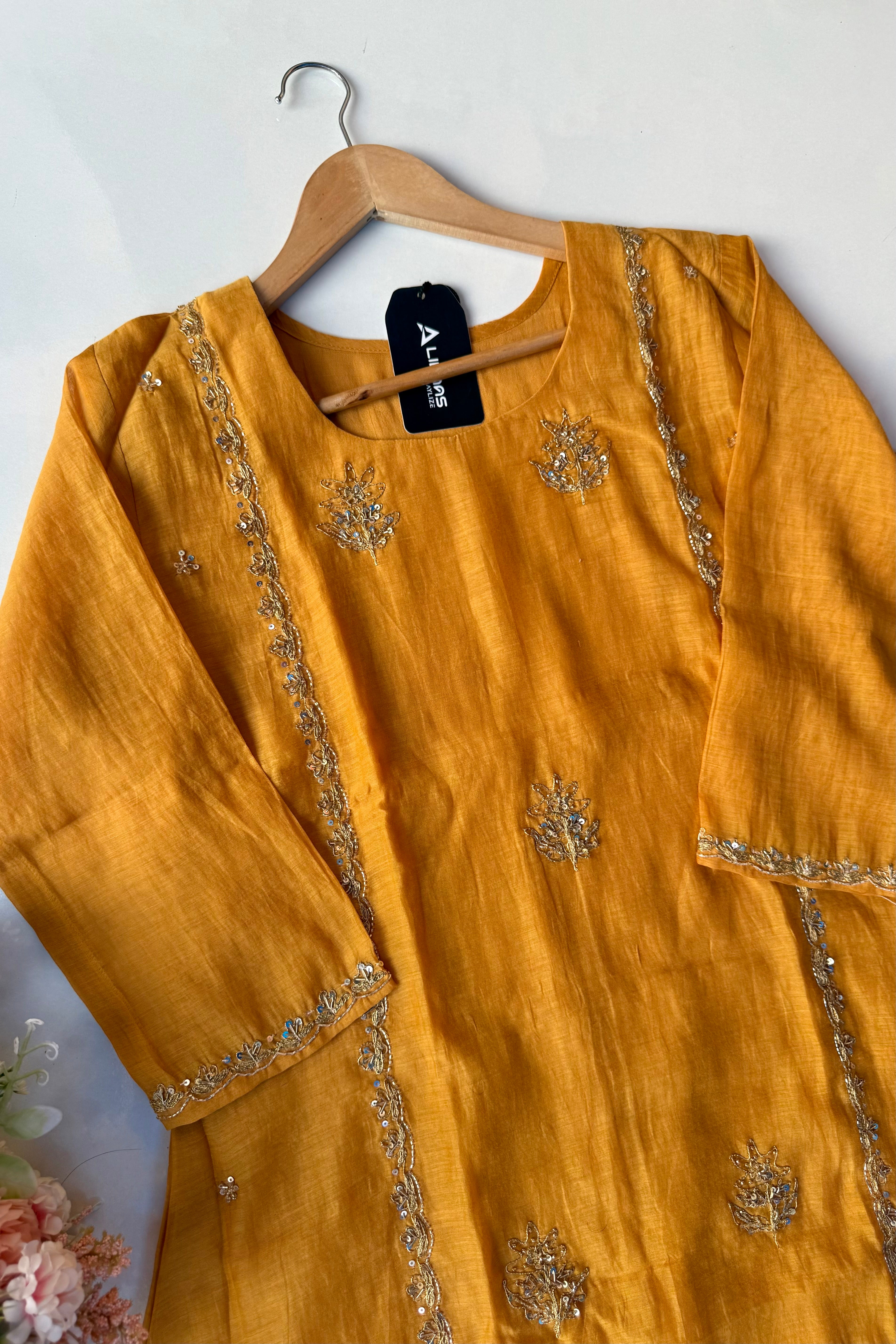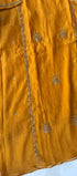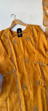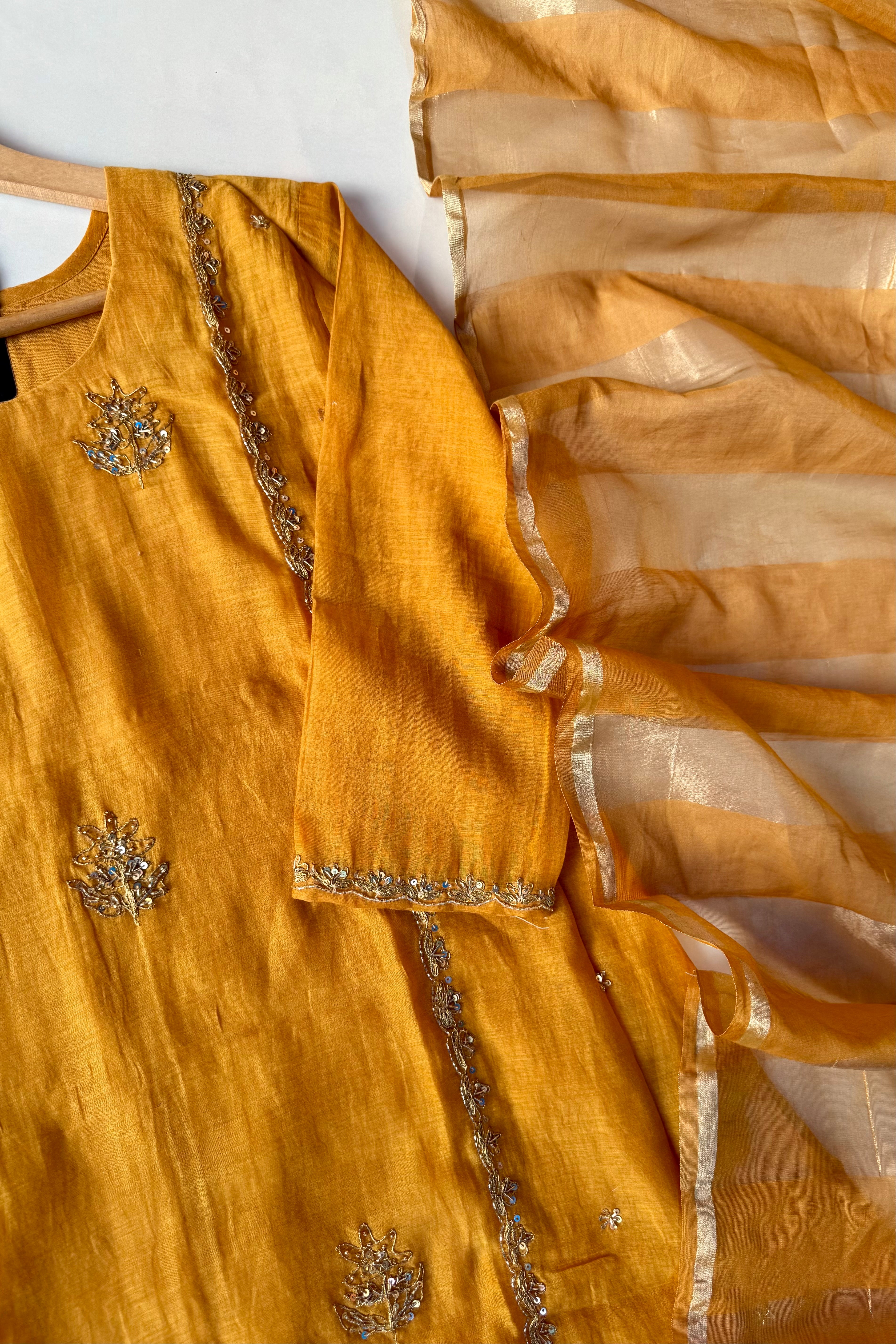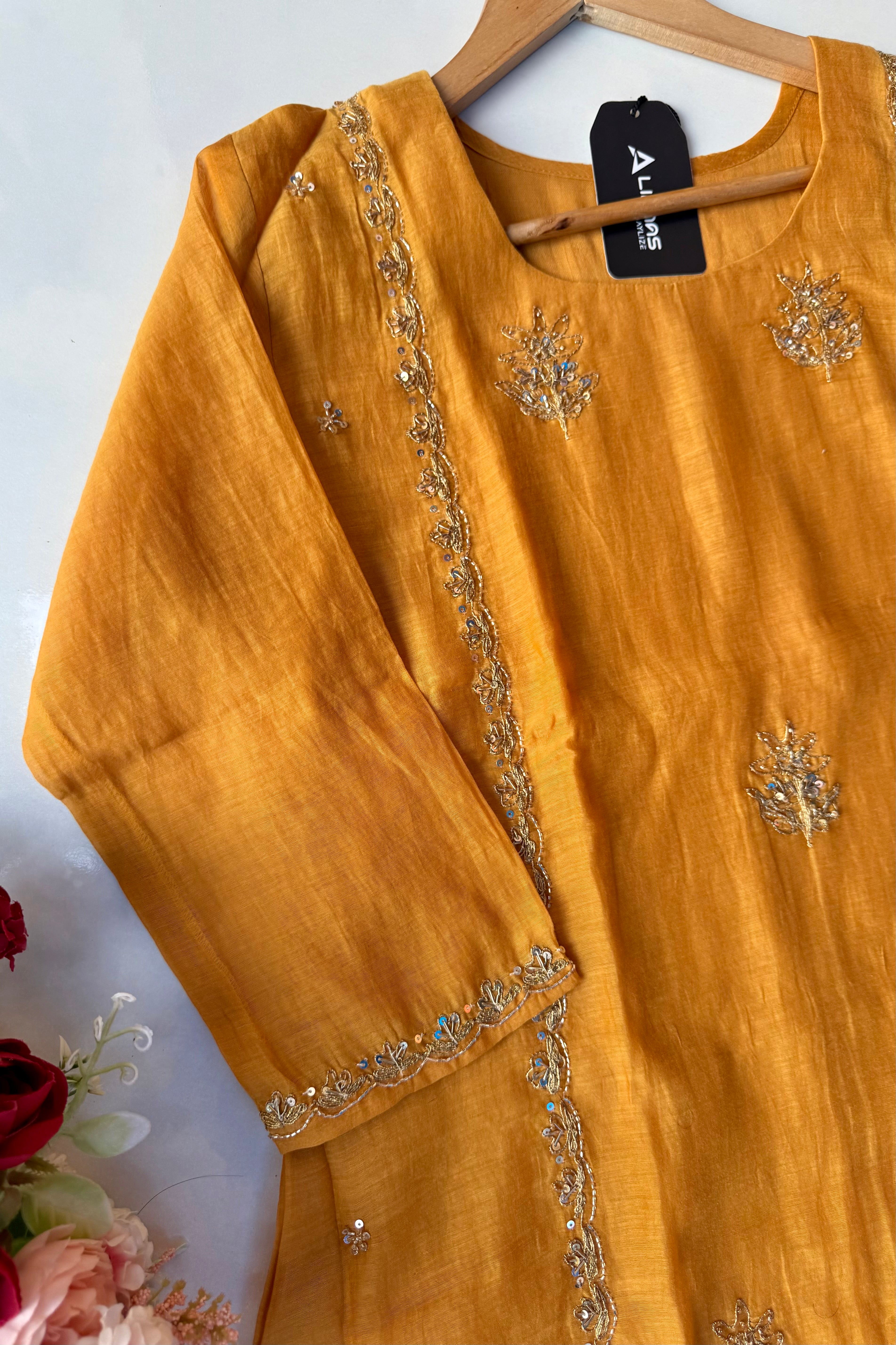 Premium Mul Chanderi a line kurta set with heavy handwork on the neck line sleeve & daman of the top with a long Mul Chanderi dupatta paired with mul chanderi bottom