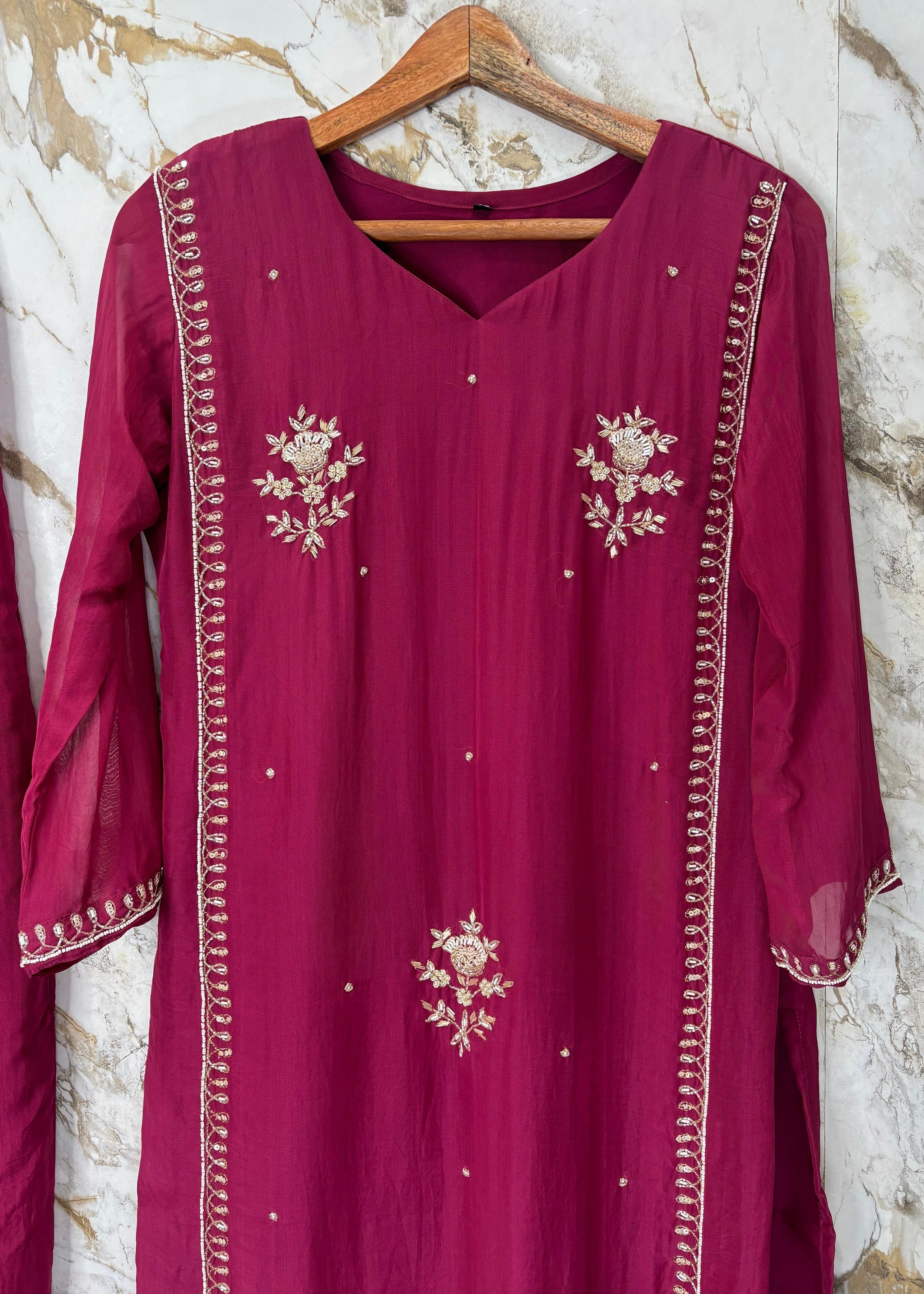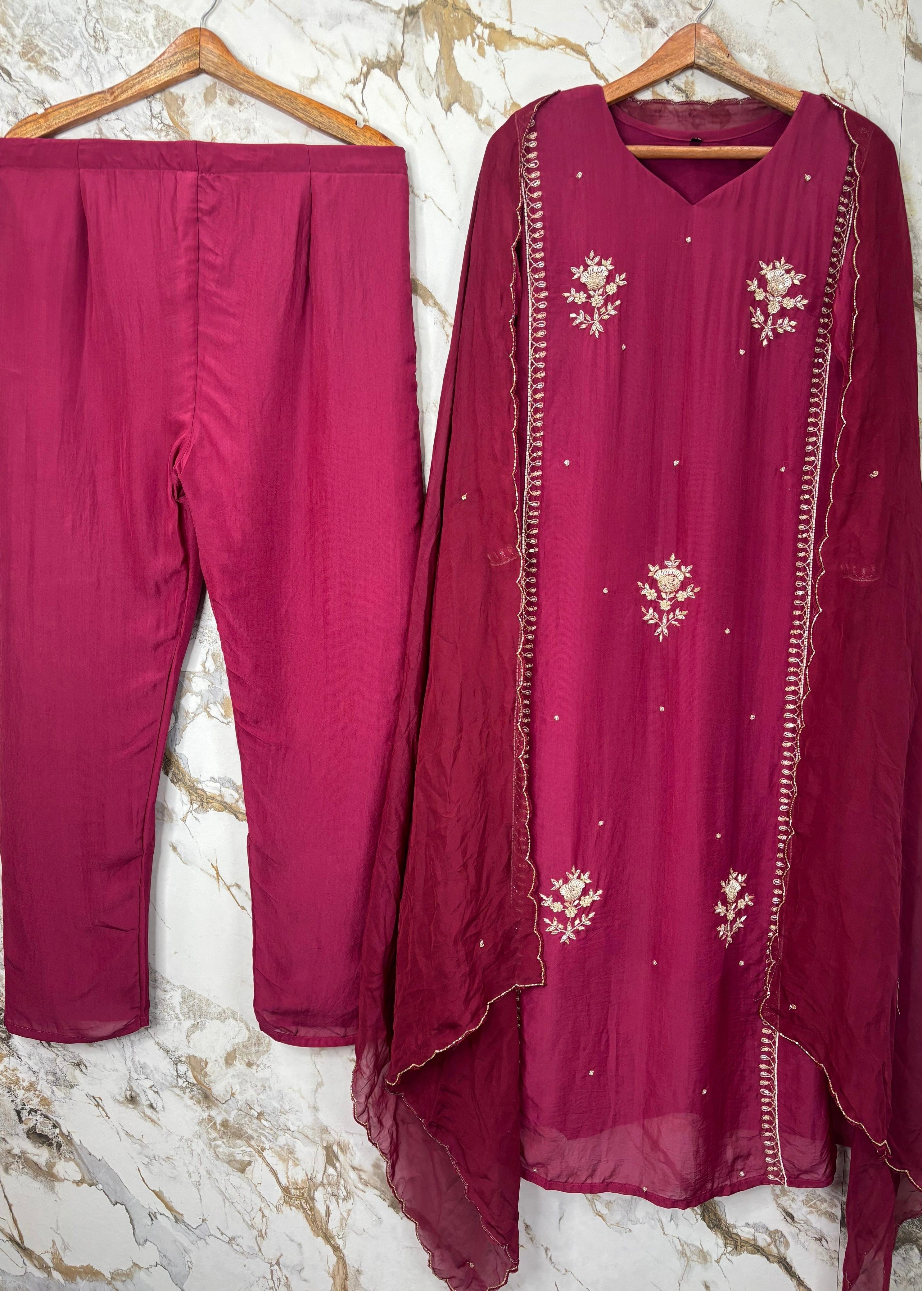 Premium Organza Viscose kurta set with heavy handwork on the neck line sleeve & daman of the top with a long Viscose dupatta paired with Orgaza viscose bottom