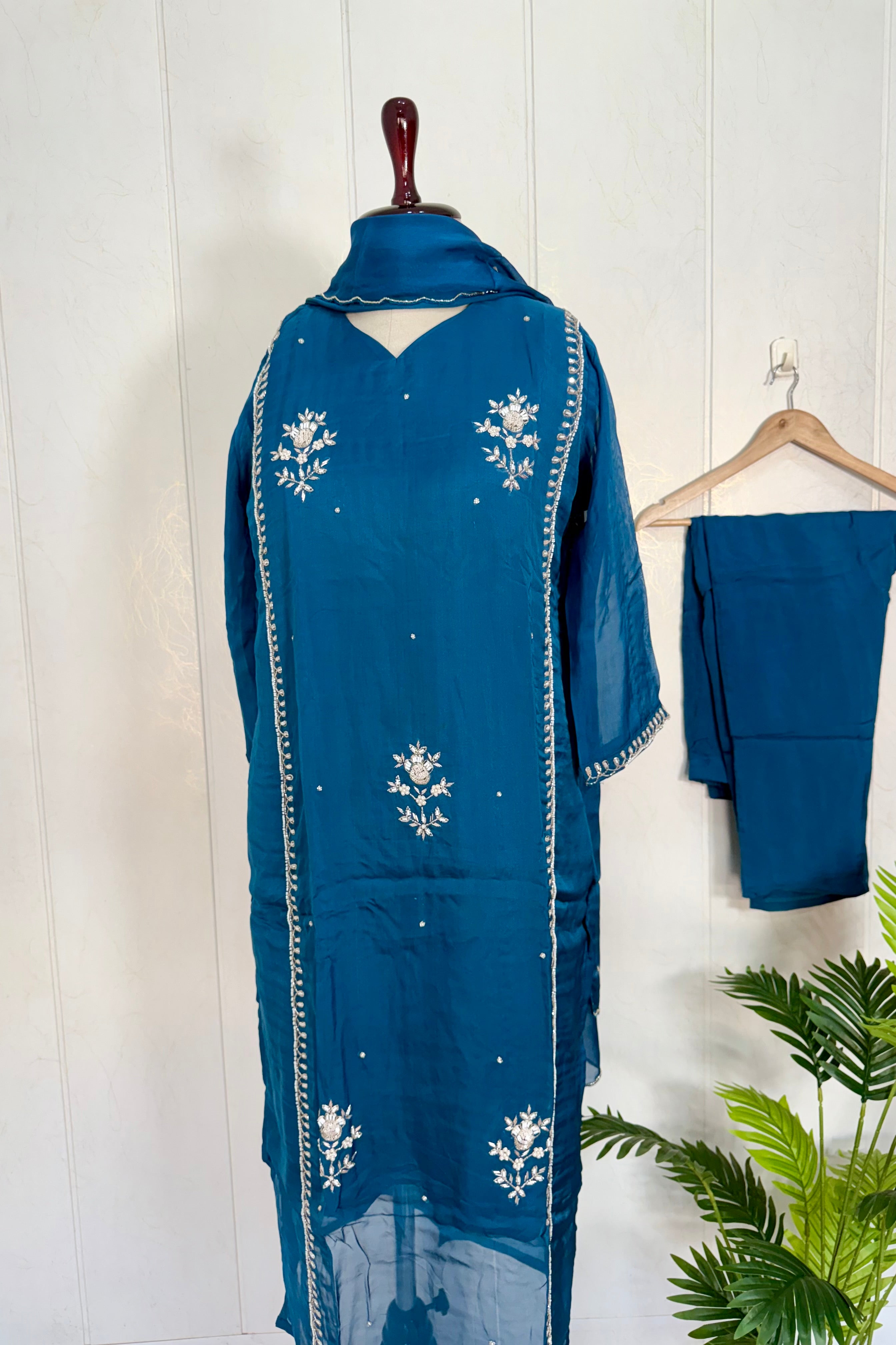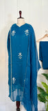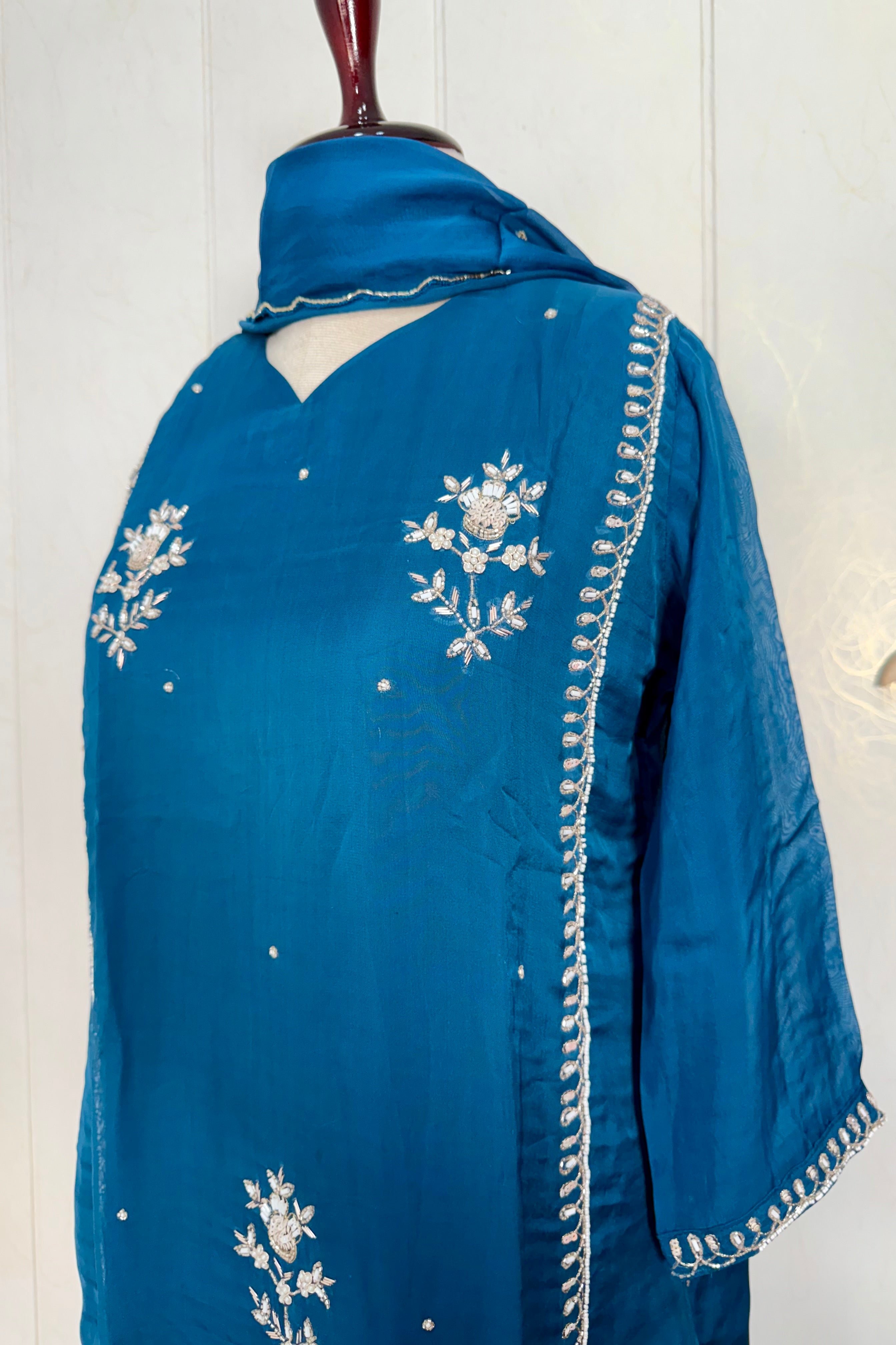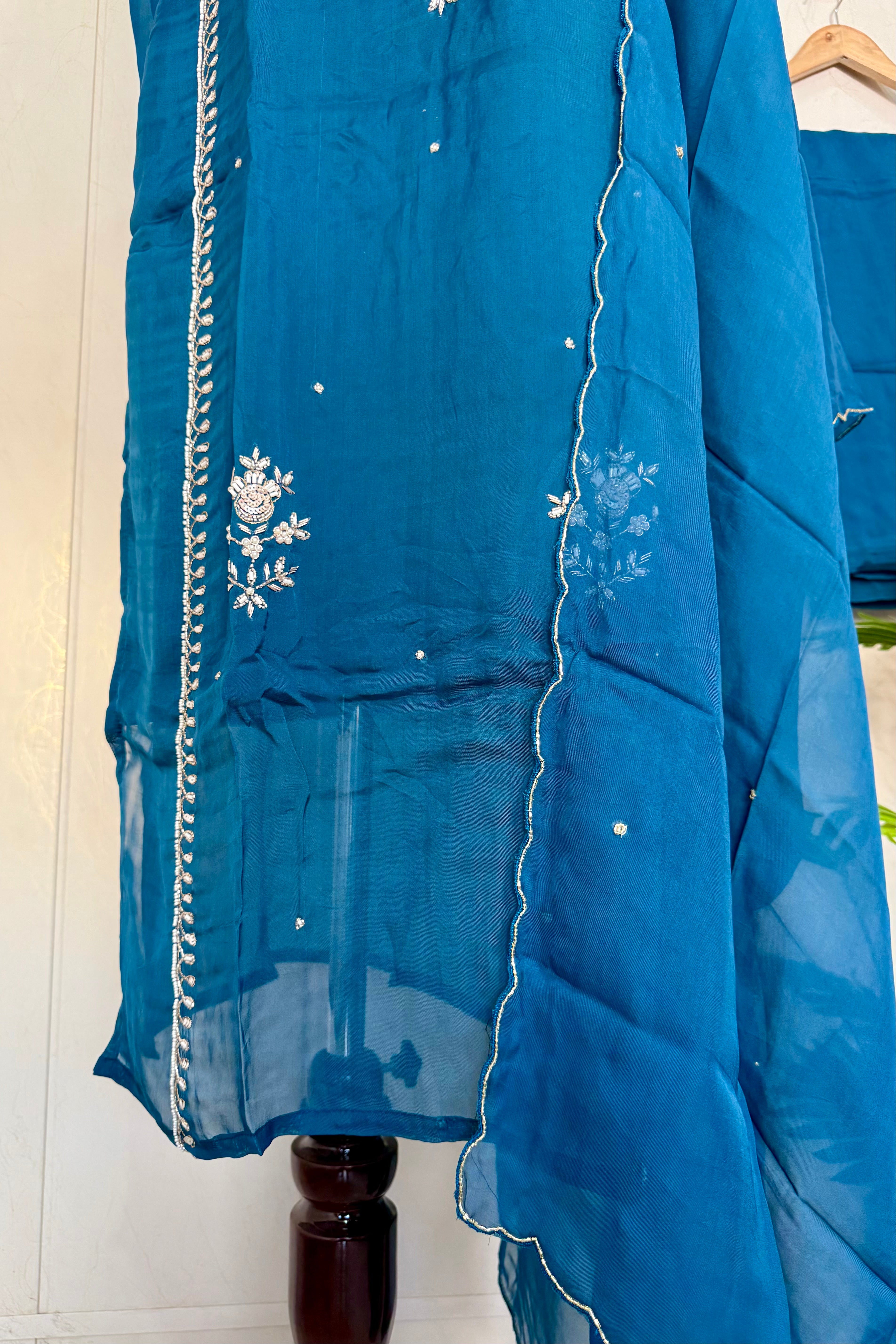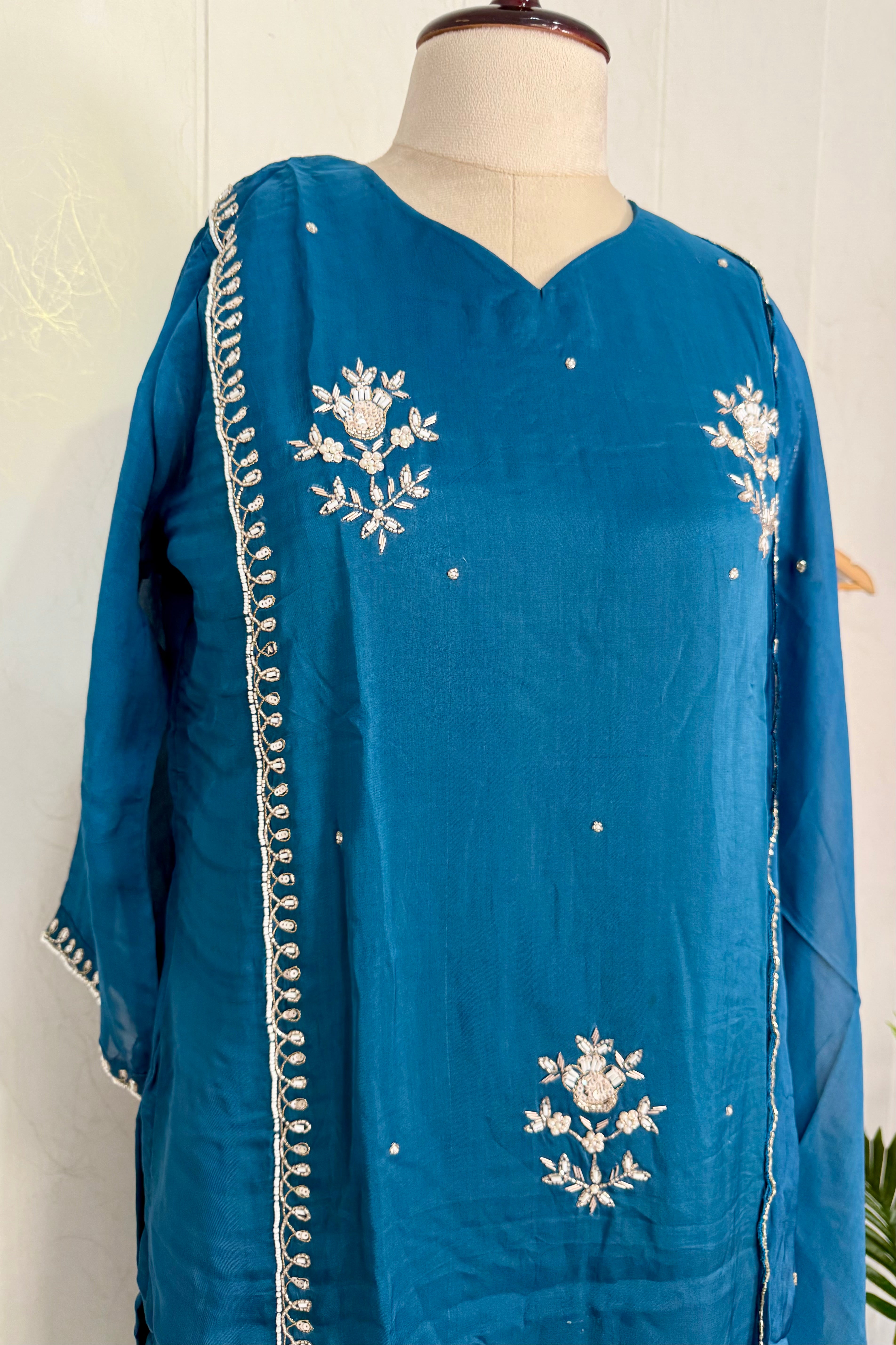Premium Organza Viscose kurta set with heavy handwork on the neck line sleeve & daman of the top with a long Viscose dupatta paired with Orgaza viscose bottom