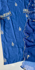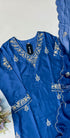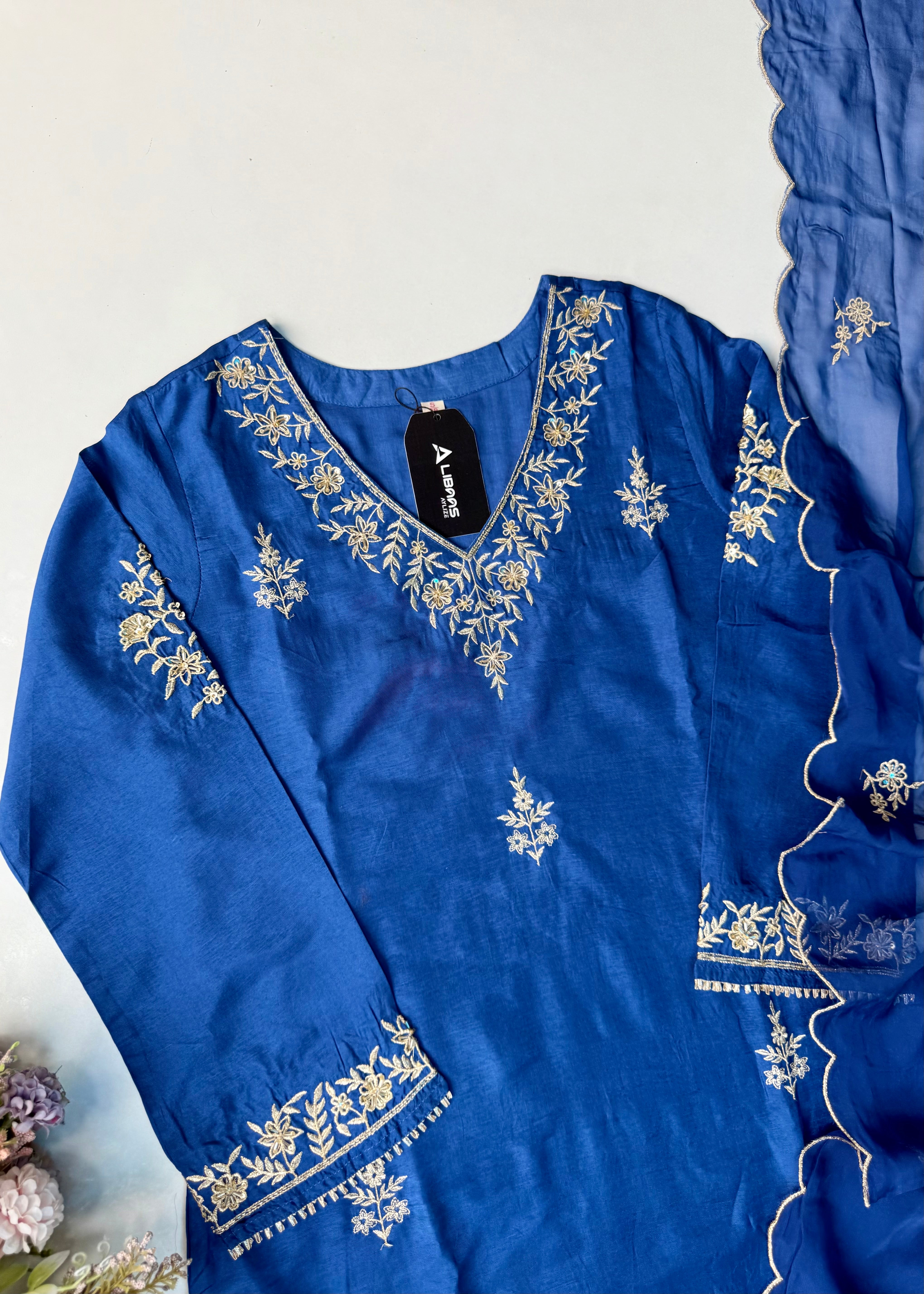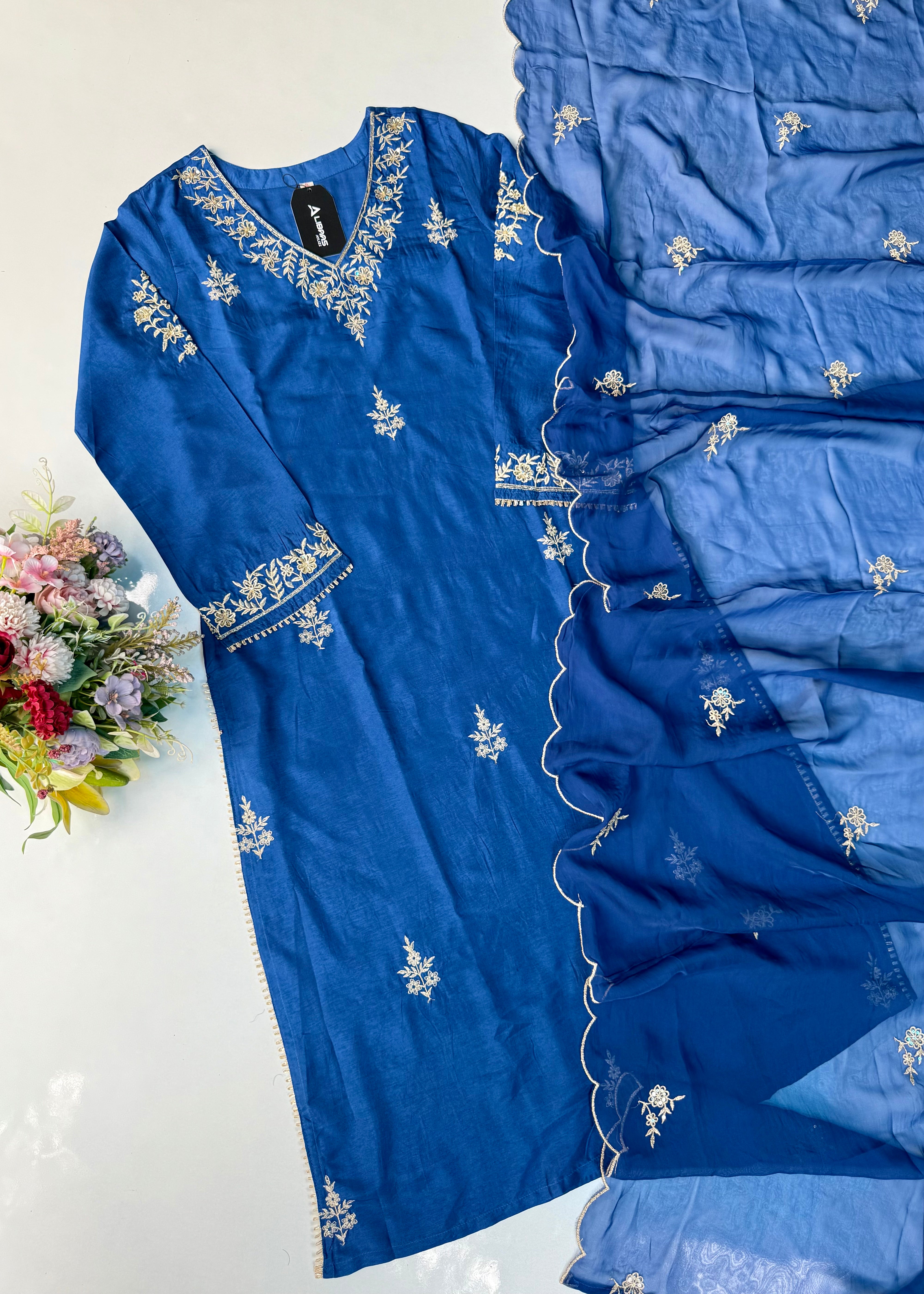 Aylize Bring timeless elegance to your festive wardrobe with this royal Blue suit set. The Dola silk kurta is beautifully crafted with hand work, featuring intricate floral motifs that add a regal charm. Paired with matching Dola silk bottom and a viscose dupatta finished with delicate embroidery and scalloped edges, this outfit is perfect for weddings, festivals, and special celebrations.