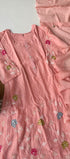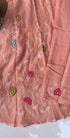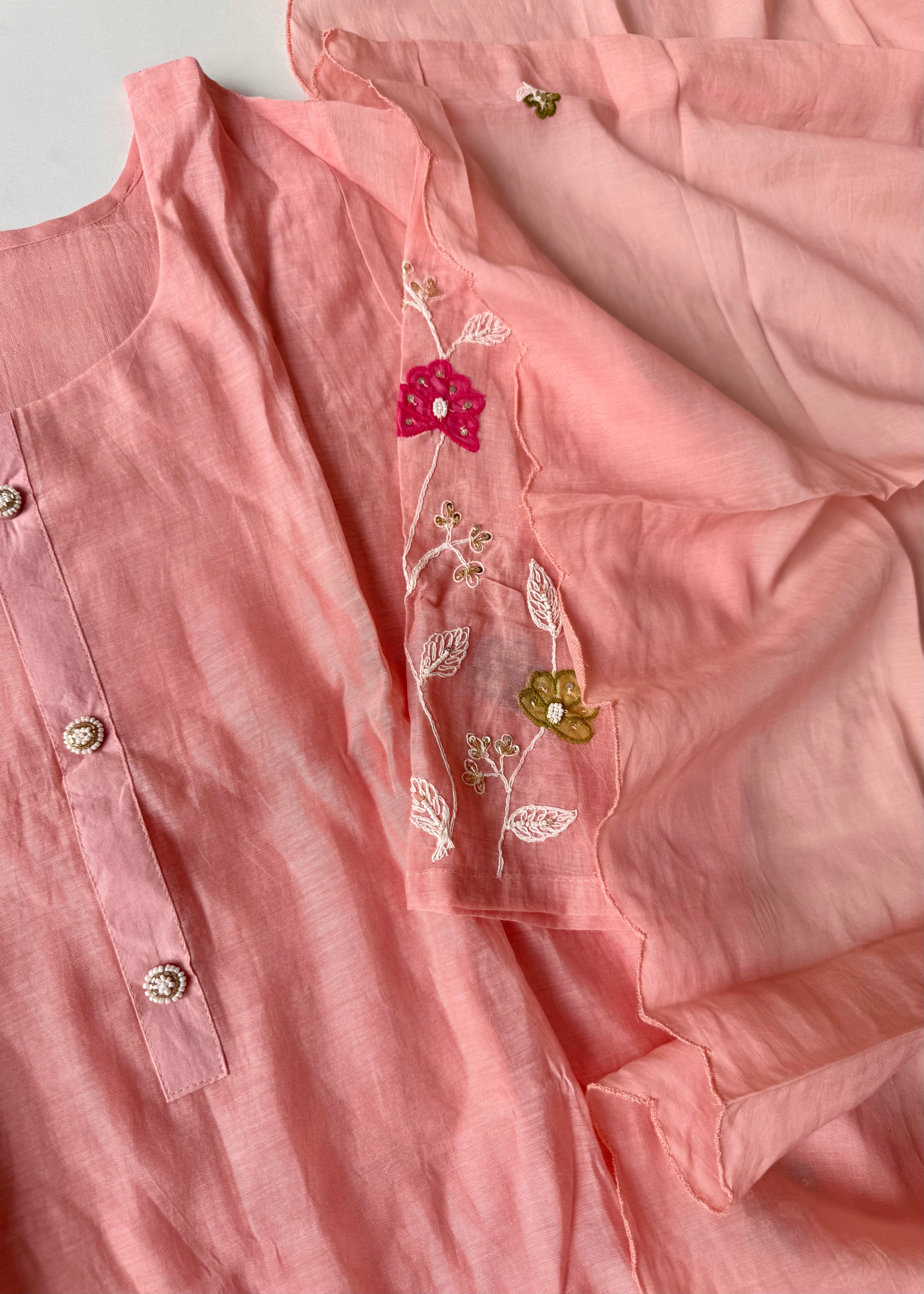 Step into timeless elegance with this peach Mul Chanderi Kurta Set adorned with delicate applique embroidery work. Designed for festive and casual gatherings, this outfit blends traditional aesthetics with comfort.