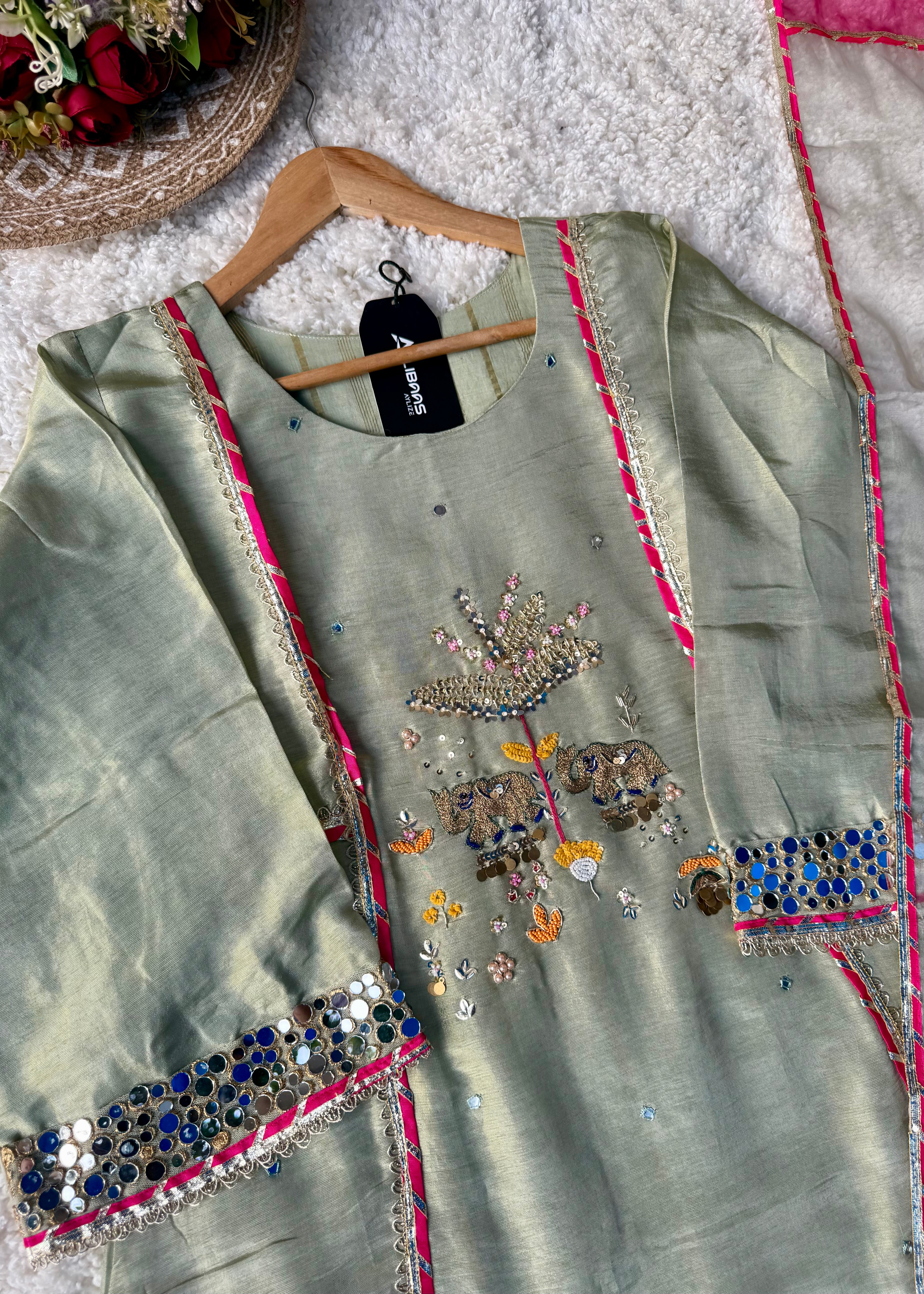 “Zara” Trending Mul Premium Mul Chanderi A Line Suit Set in Olive Green