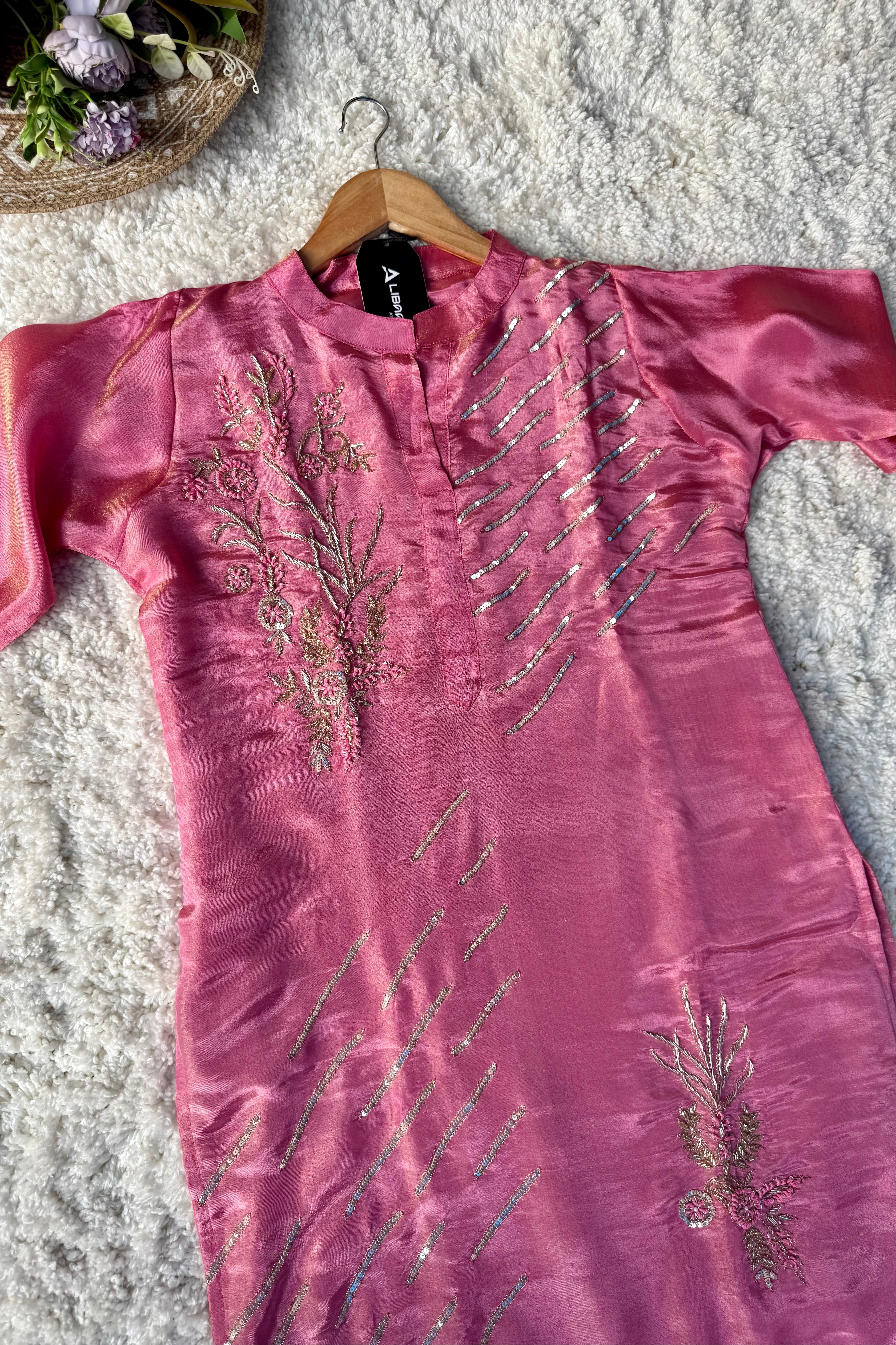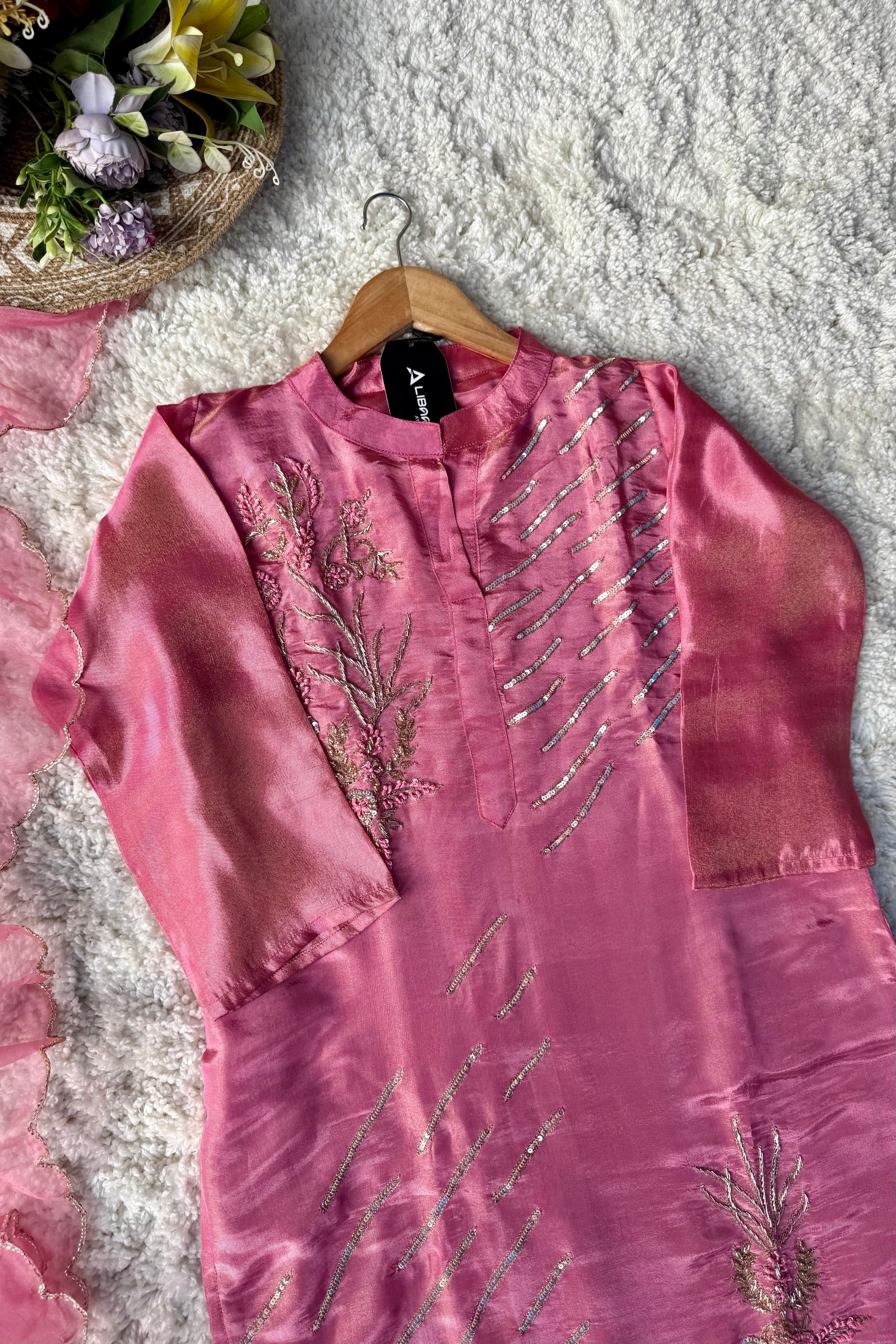 “Zena” Dusty Rose Pink Tissue Silk Kurta Set with Elegant Handwork